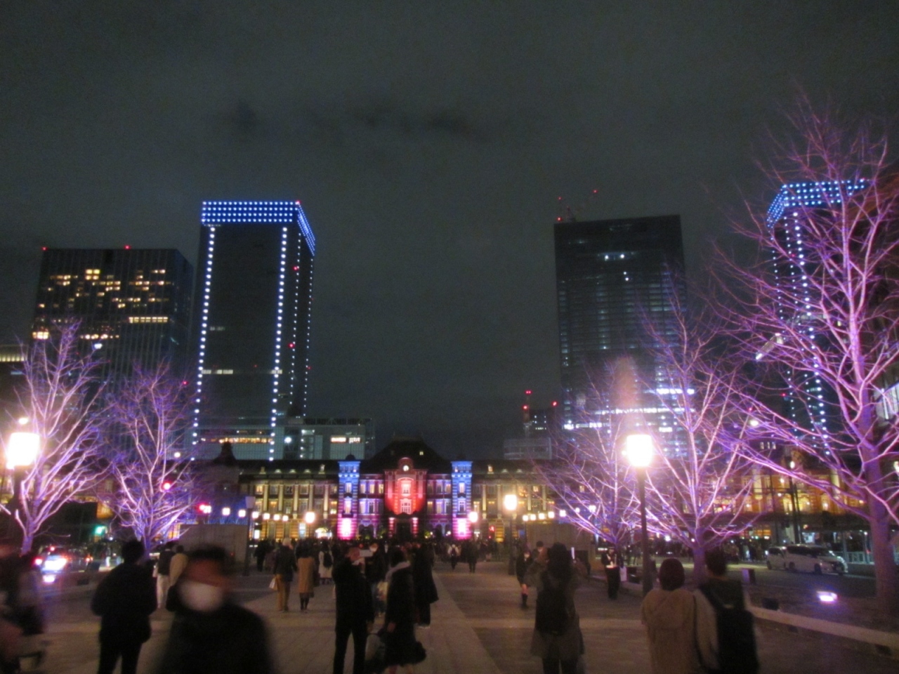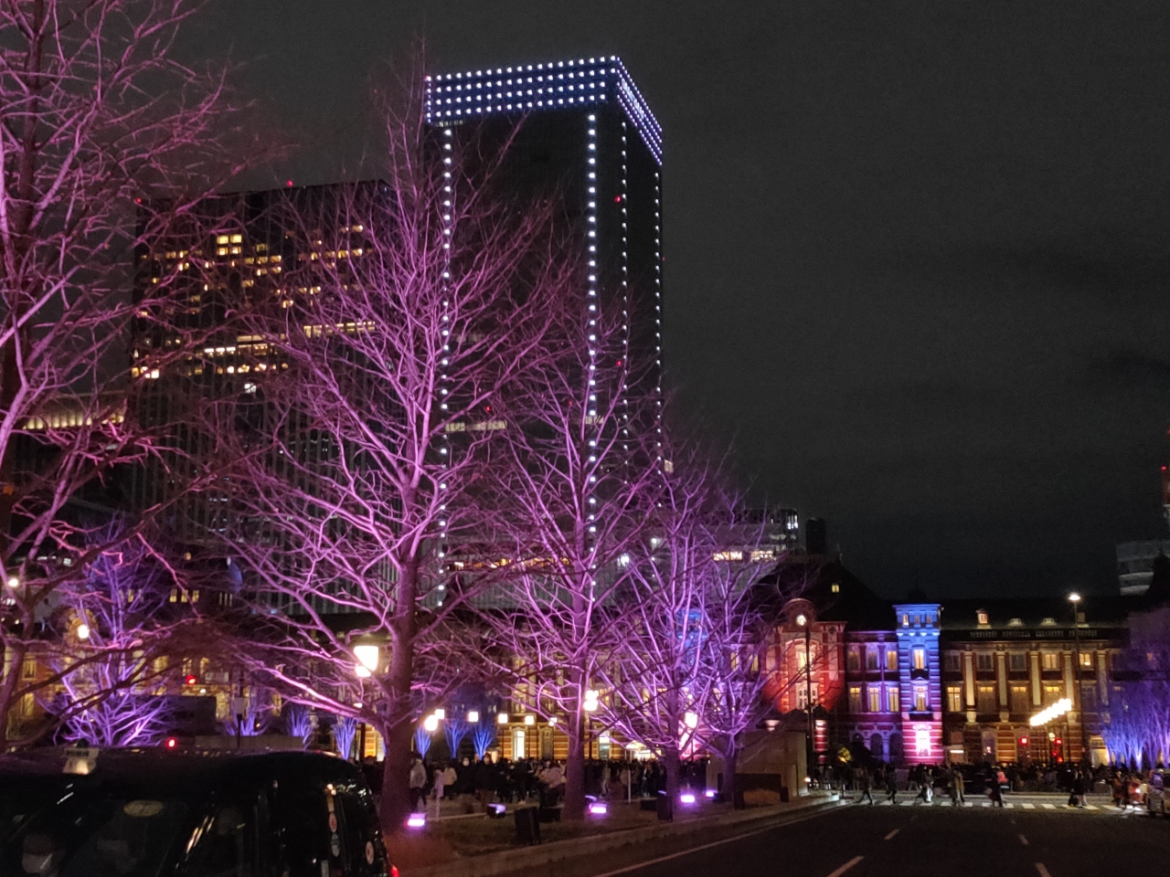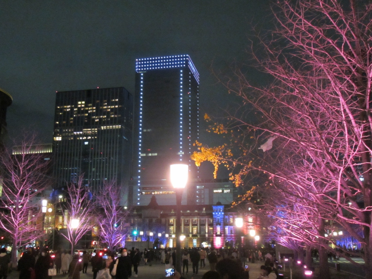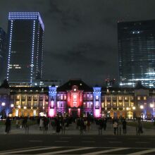 2021年は12月14日から25日まで(15時から21時)の期間、東京駅の赤レンガ駅舎や駅前広場の御幸通りの街路樹をカラフルにライトアップされていました。昔、行われていた3Dマッピングよりやや地味な感じになりましたが、それでも威厳のある歴史的建物のライトアップは美しいものです。同期間(2021年11月11日~2022年2月20日)、東京駅から御幸通りを少し行った丸の内仲通りでもイルミネーションが輝いているので、併せて訪れるとよいと思います。東京ミチテラスの方は、21時までと、夜、比較的早い時間に終わってしまうのが注意点です。また、御幸通りの地下が新型コロナのワクチン会場になっていて、地下からアクセスしにくくなっていました。