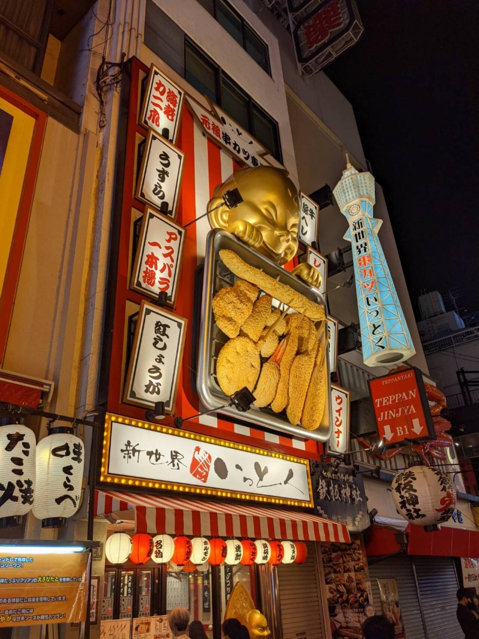 道頓堀商店街にある串かつの専門店です。道頓堀商店街には、大きなオブジェを店頭に飾っているお店がたくさんありますが、特に、このお店は、大きなビリケンさんと串かつのオブジェが飾られていてインパクトがありました。串かつは、どれも揚げたて、サクサクで美味しかったです。特に、アスパラ一本揚げと紅生姜はおすすめです。