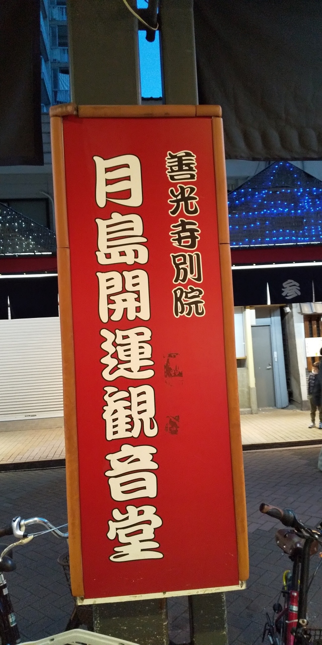 もんじゃで有名な西仲通りにある観音堂です。月島温泉の入り口付近にありスーパーダイエー月島店の隣、ビルの通路の入り口から奥まった先に賽銭箱と観音堂がありお参りができます。こんなところになをんと驚きの善光寺の別院があるのです。もんじゃ食べてお詣りができます