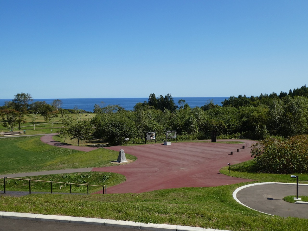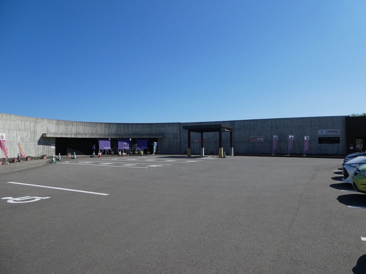 コンクリ打ちっぱなしのシンプルな平家建ての左が資料館で右が道の駅の施設になってます。そして一番右の端から遺跡に降りる道があります。なお、入場時間が決まっていて9時から17時と短いです。クマ予防のためもあるのかもしれません。遺跡公園は高低差もありずいぶん広いので、時間がない場合は展望台から遺跡の全景を眺めるだけでもいいかもしれません。