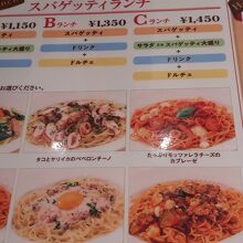 ランチの時間に行きましたが、スパゲッテイ、ドリンク、デザートがセットで1200円~ほどでした。