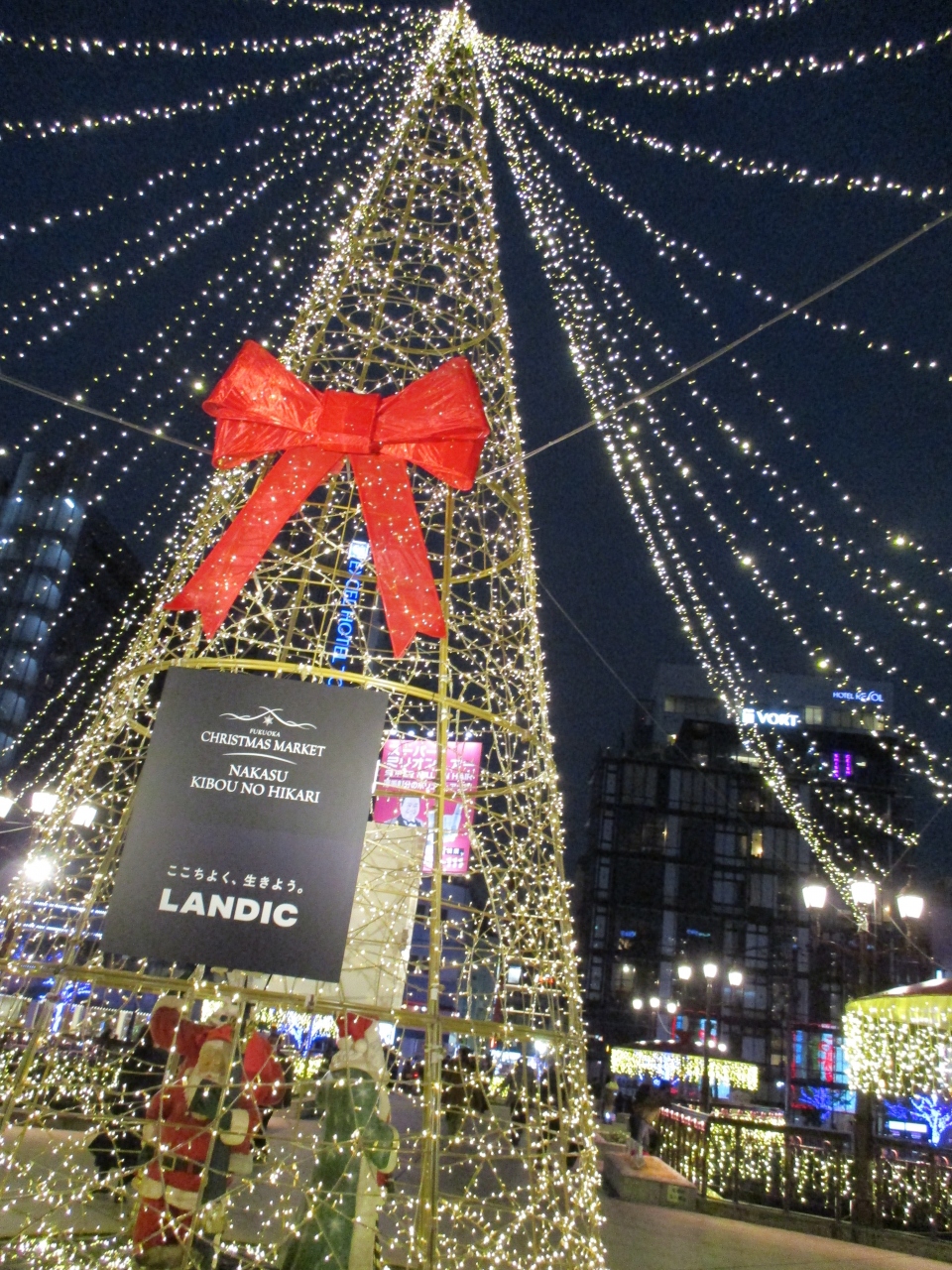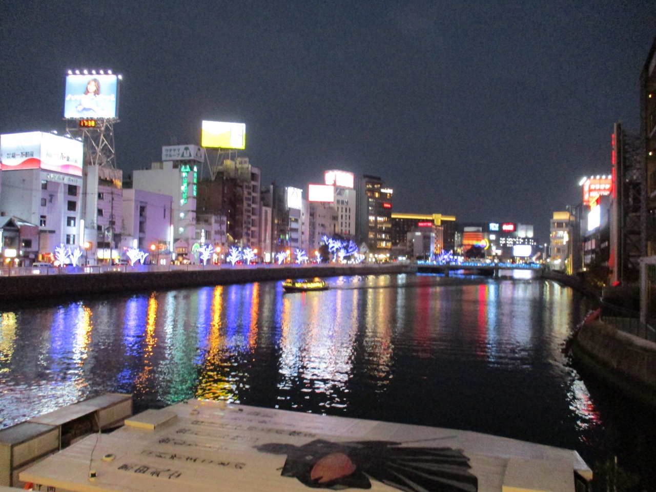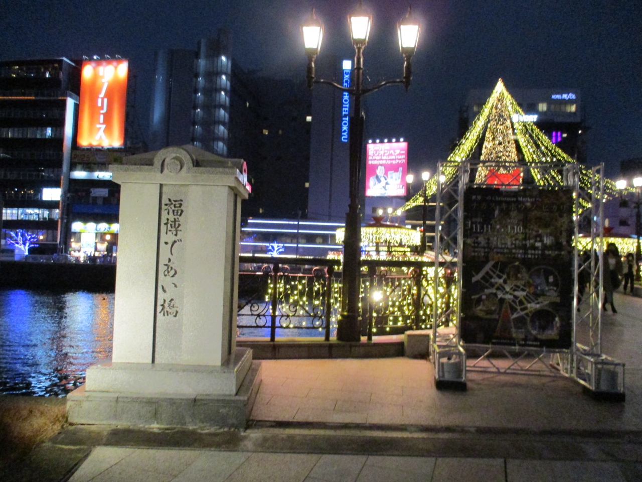 福岡の中州で食事をする前に、近辺を散策していて渡った那珂川に架かる橋です。人道橋なので車の心配もなく、なにより年末が近いからかイルミネーションの飾り付けが最高でした。川面に光が輝いていてとても美しく、たくさんのカップルが写真を撮影していました。