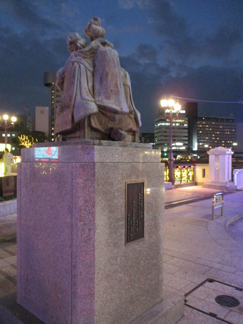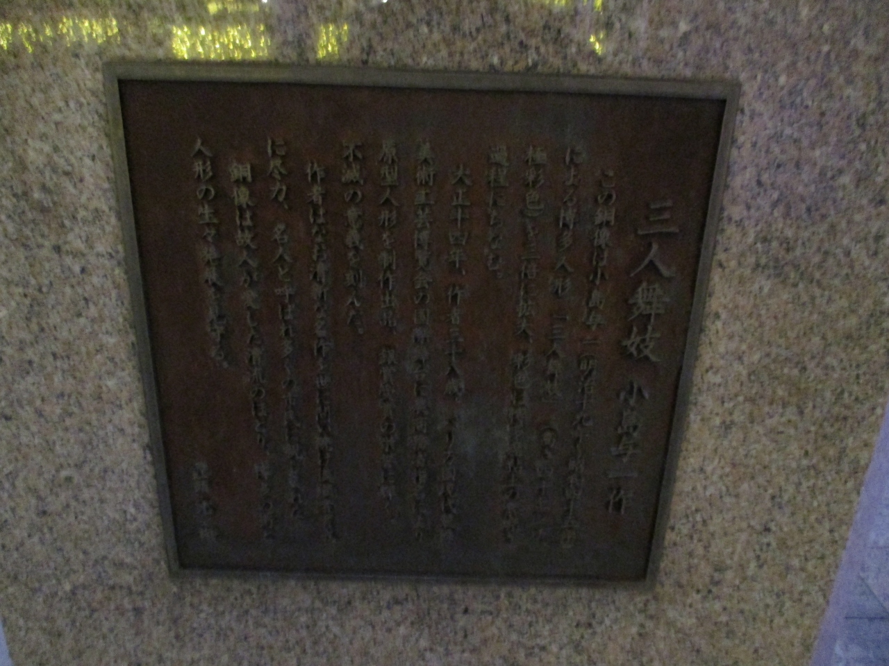 博多の中州に行った時に、那珂川に架かる福博であい橋の袂に、像が建てられていました。博多人形の代表作を大きくして、銅像として飾ってあるそうです。銅像とはいえ博多人形の姿がそのままなので、情緒が感じられて良かったです。博多の街を見守っているように思いました。