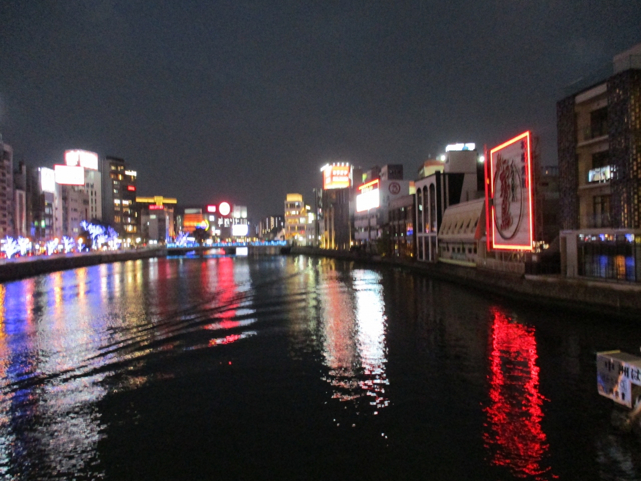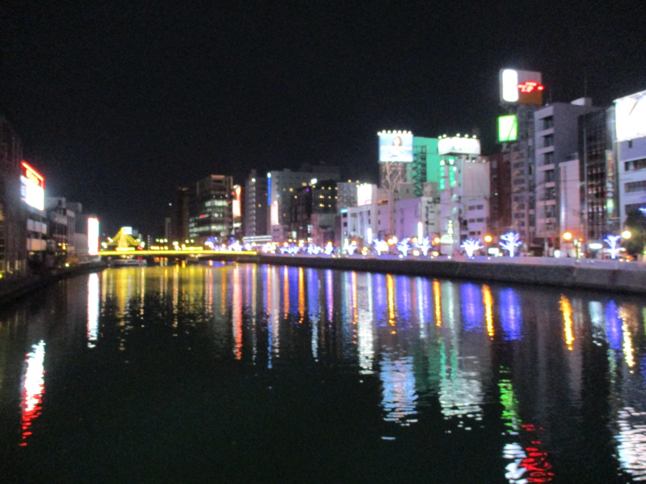 博多の中州に行った時に、中州の中央部分を流れている那珂川を見物しました。ちょうど夜になっていたので、周辺のネオンや灯りが川面に映ってとてもきれいでした。以前は川が汚れていた時もあったそうが、現在はリバークルーズも出来るようになっていました。