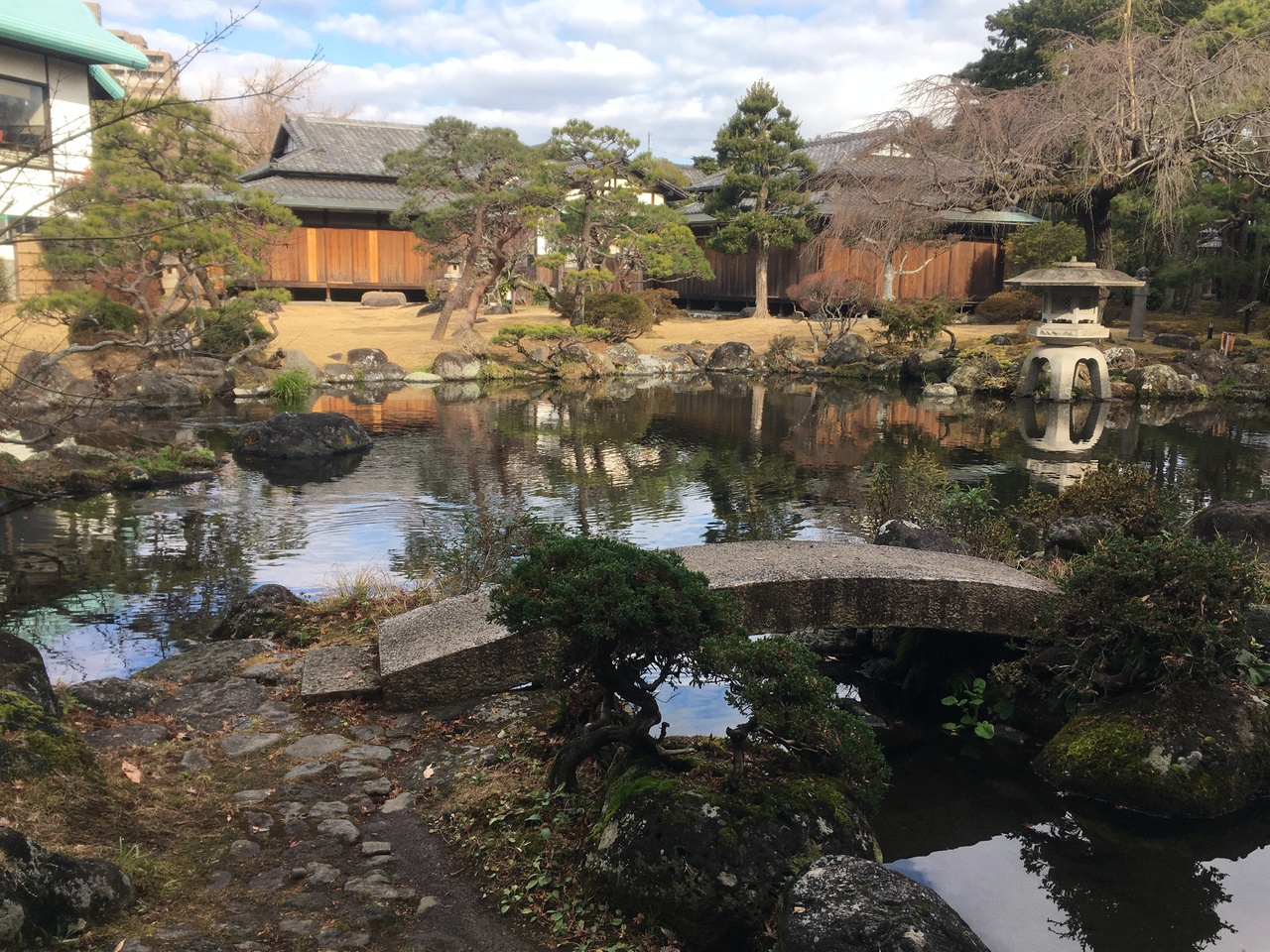 伊豆箱根鉄道駿豆線「三島田町駅」から徒歩で5分ほどです。佐野美術館の創始者佐野隆一氏が昭和初期に彼の両親に贈るために造られた日本家屋と池泉回遊式庭園です。御殿川の湧水を利用した心字池を中心に造園されています。溶岩らしい石も使われています。表門と家屋が国の有形文化財に指定されています。美術館は有料ですが、庭園は無料で散策出来ます。