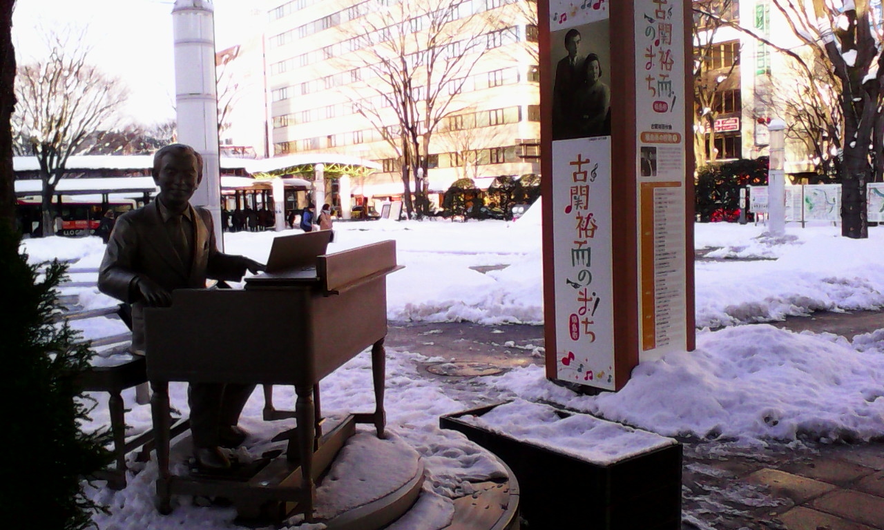 最近、NHKの朝ドラで話題になったせいか、ピアノを弾く銅像の周辺の柱を使って古関氏の生い立ちや作曲した作品を紹介していたり、「古関裕而のまち」と横断幕が出ていたりと楽しげな雰囲気で良かったです。