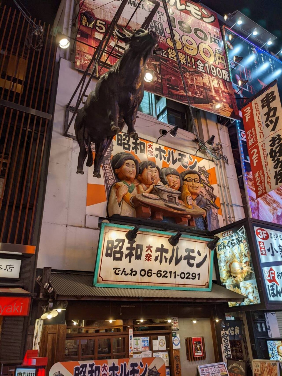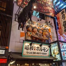 道頓堀商店街にある焼肉屋さんです。道頓堀商店街には、大きなオブジェを店頭に飾っているお店がたくさんありますが、このお店も黒毛牛のオブジェが飾られていました。焼肉のメニューは種類も豊富で、値段もリーズナブルなので、たっぷりと焼肉を食べたい人にはおすすめのお店です。