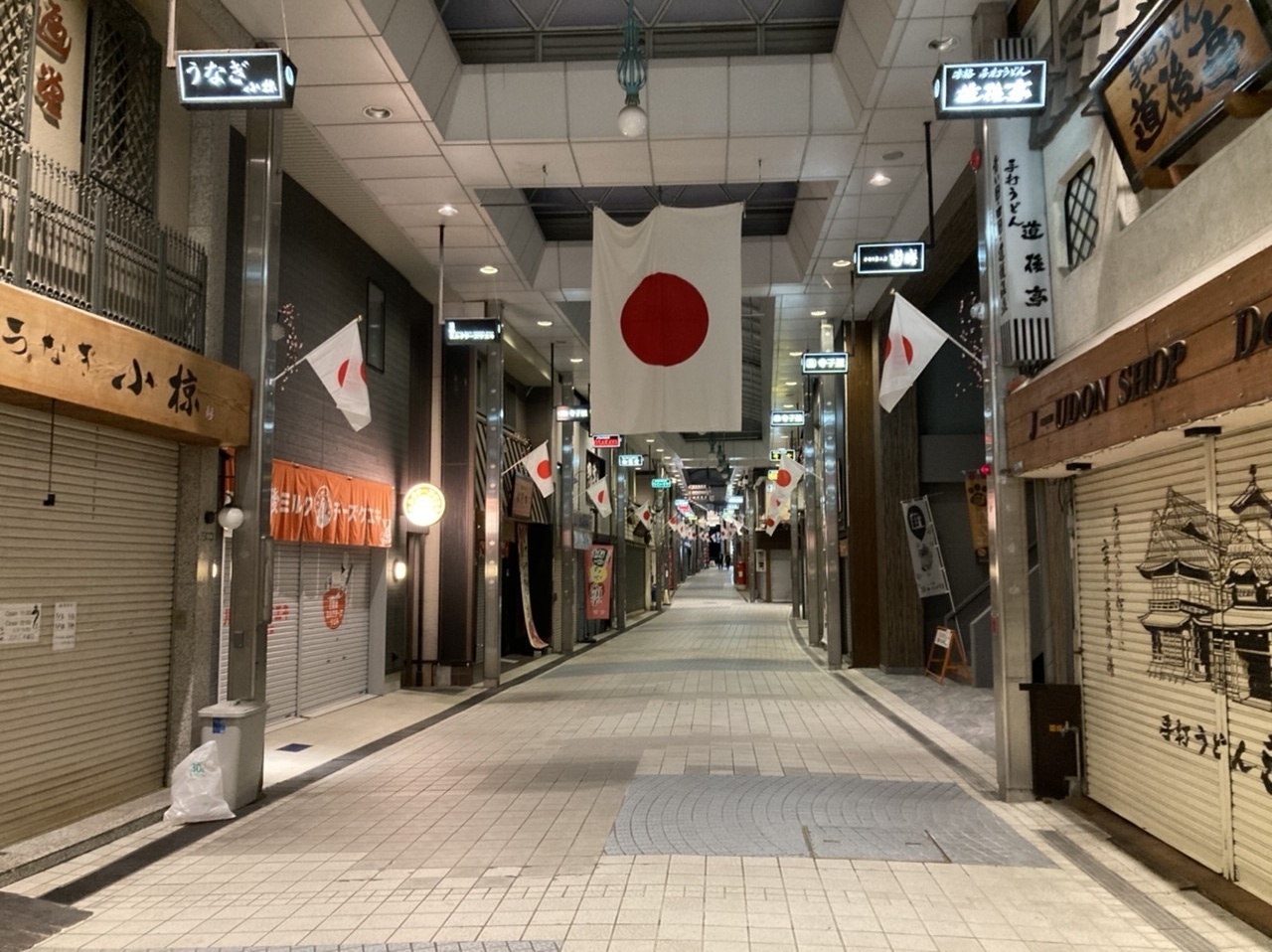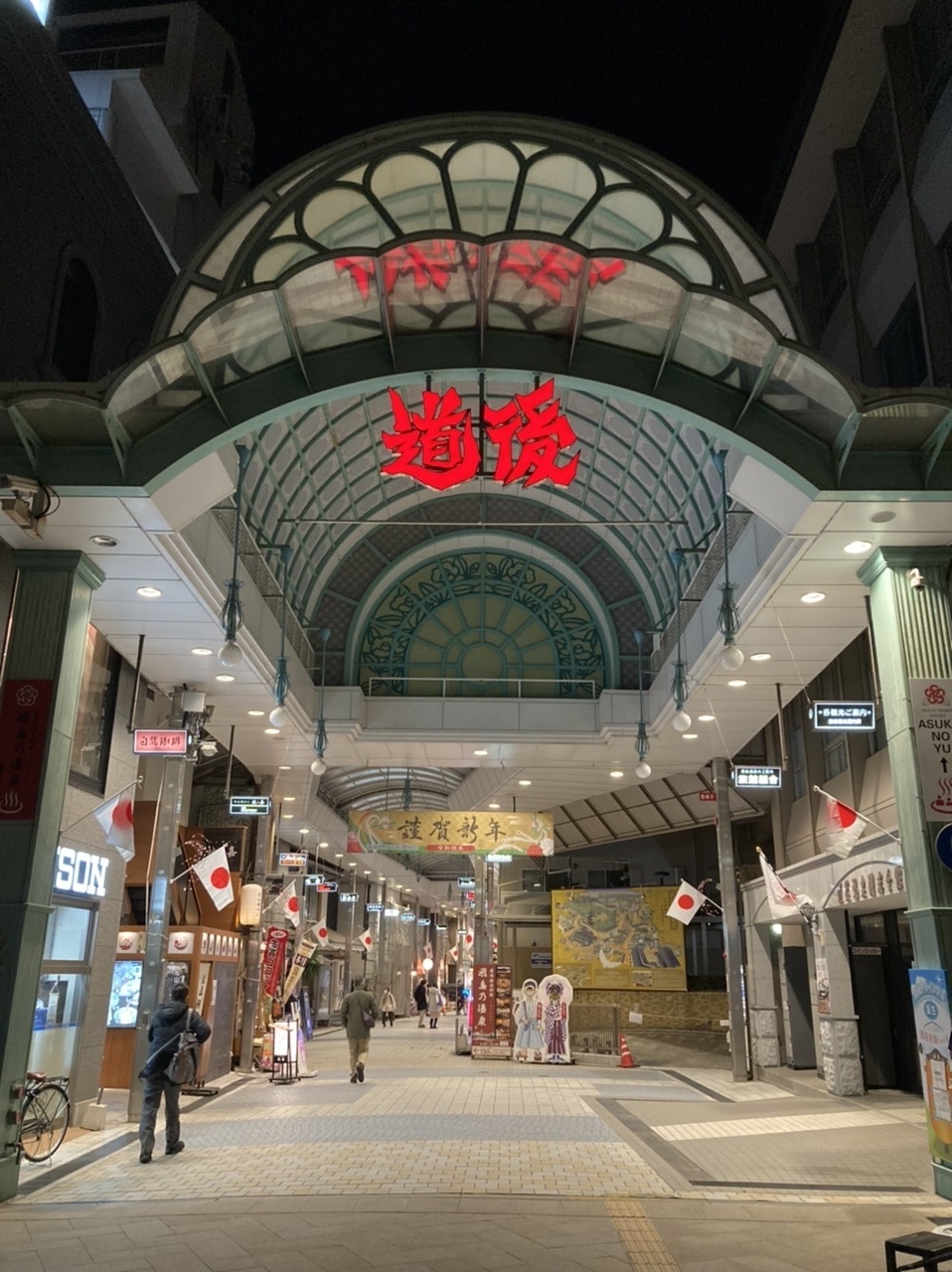 道後商店街は、"ハイカラ通り"の愛称で呼ばれ、伊予鉄道の路面電車の「道後温泉駅」から共同浴場「道後温泉本館」を結ぶ約250mのアーケードです。