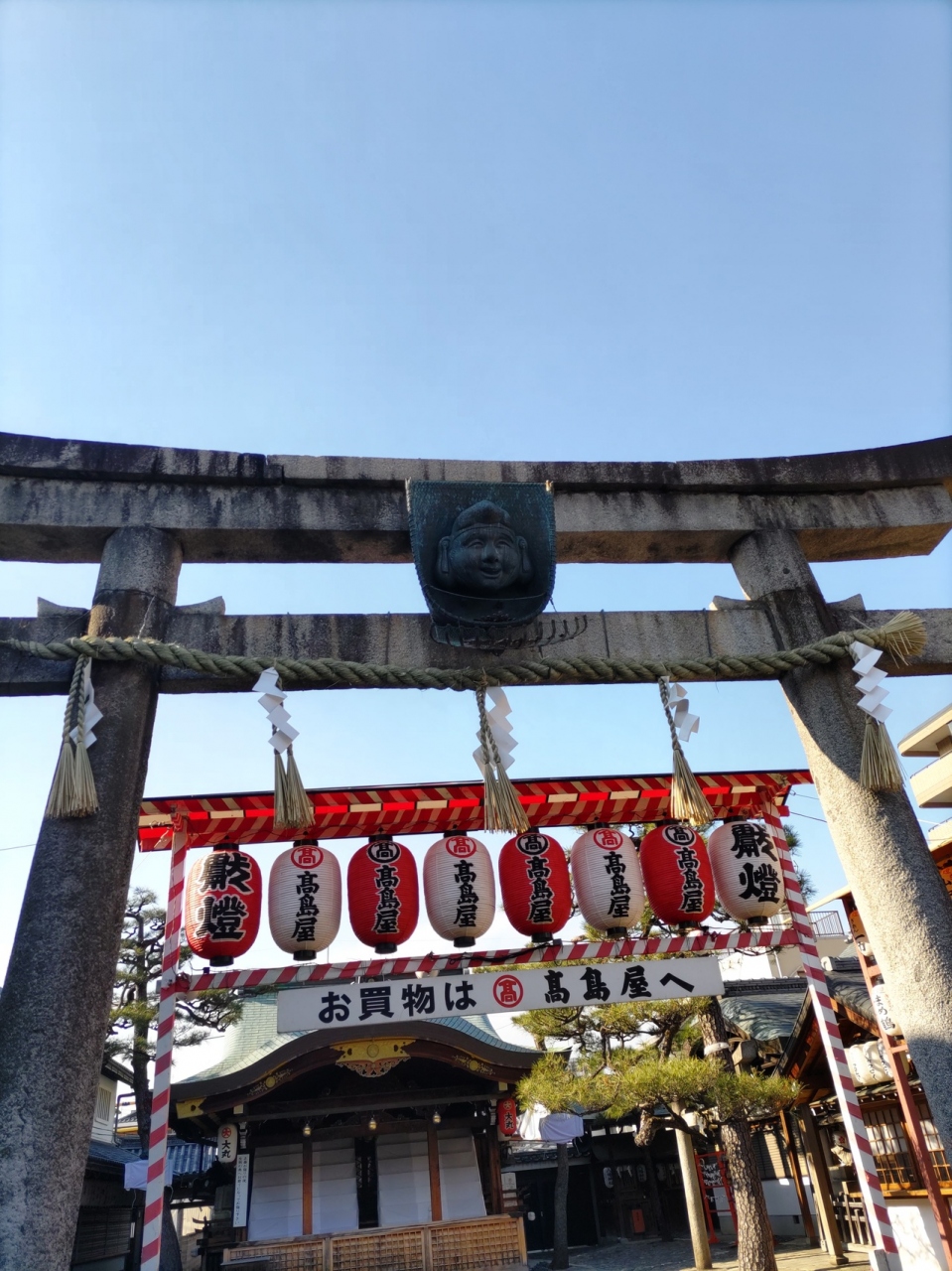 人気の観光スポット、京都にある神社です。京都えびす神社は日本三大えびすとして、えべっさんの名称で親しまれています。商売繁盛の神様です。鳥居にえびす様の顔がありかごの中に商売繁盛を祈願して小銭を投げ込みました。