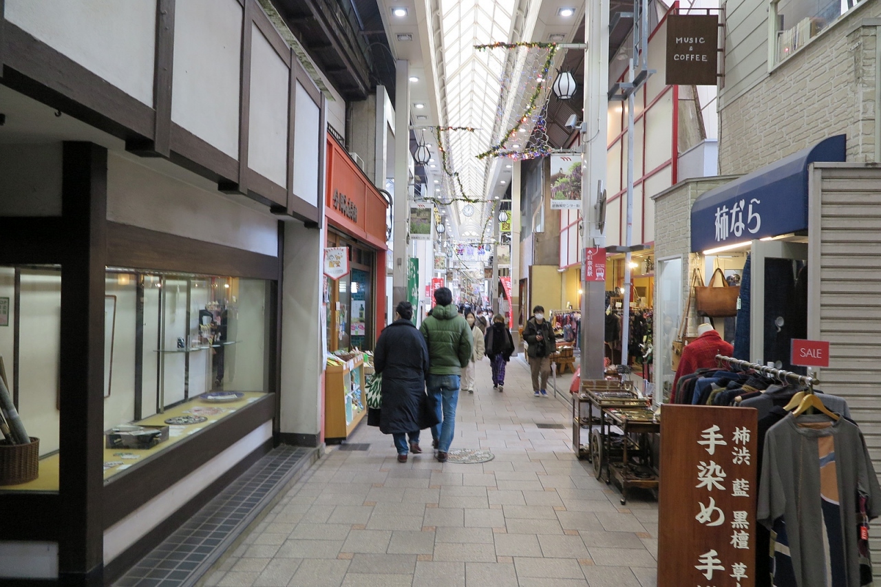 日本全国津々浦々で商店街がシャッター化しています。たとえシャッター化していなくとも、コンビニ・ファストフード・カラオケなど、大資本の店舗が並んでいるところも少なくない中、こちらの商店街は地元のお店ばかりで何とも嬉しくなります。お茶屋さん、土産物屋さん、古本屋さん、FM放送スタジオ、アジア料理店、有名なうどん店まで多様なお店が楽しいでぅ。いつまでも、こんな商店街を残していけたらなぁ…。