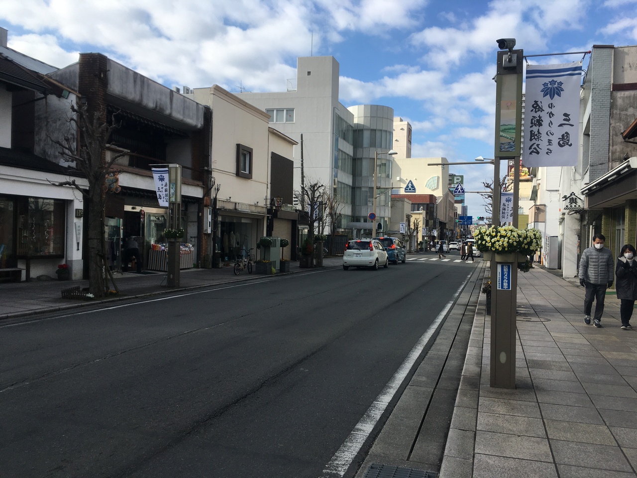 三嶋大社から三島広小路駅までの国道1号線(旧東海道)沿いの東西約700mの大通りに面する3つの商店街です。日用品店、飲食店、土産物店など数々の商店が軒を連ねています。また三島を代表する御殿川、源兵衛川など湧水の流れとも交差しています。訪れた日は三嶋大社への初詣客で道路も歩道も混雑していました。