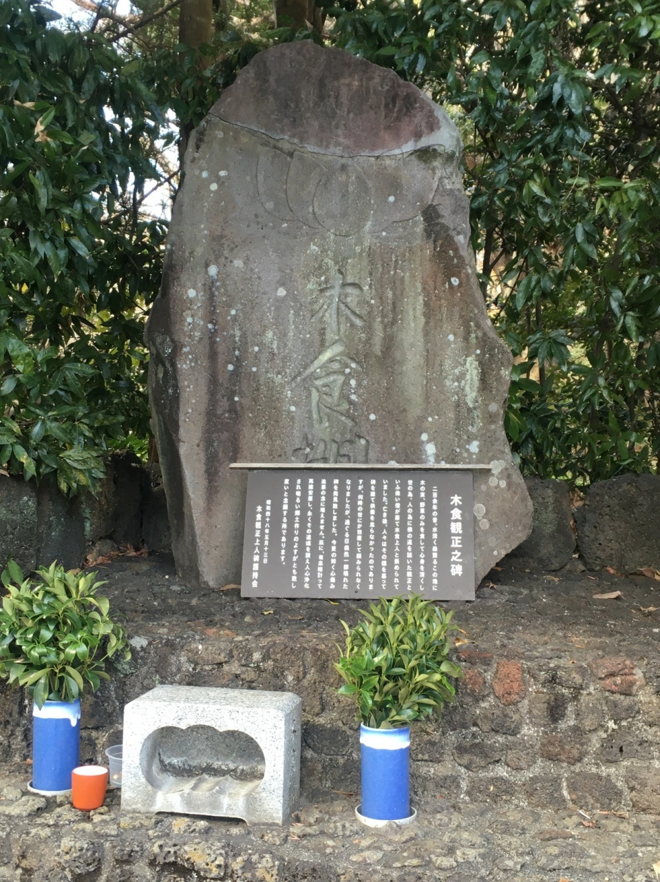 三島駅南口から西へ徒歩で5分ほどです。楽寿園南の道沿いです。江戸時代後期、加持祈祷をして関東周辺を遊行する「観正」という僧がいたそうですが、木の実や野草だけしか食さない修行をしていたので「木食上人」と崇められていました。亡き後、人々はその徳を慕って碑を建て供養を怠らなかったということです。