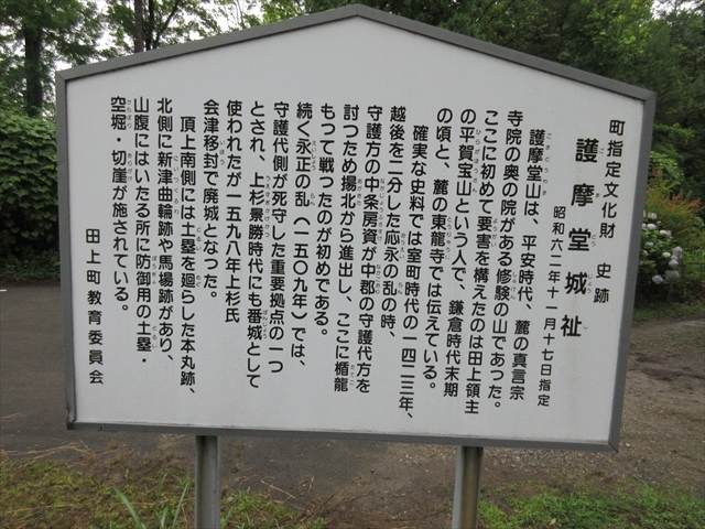 元々は護摩堂城跡という鎌倉時代に建てられた砦が最初だったようで,田上町の指定文化財になっていました.その後,大部立派なお城も建てられたようですが,今残っているのは本丸の後や土塁の後などで,典型的な山城といった感じです.駐車場から本丸跡までは2km弱あり,急峻ではありませんが,それなりの坂道を歩く必要があります.本丸の下には茶店もありましたが,周年で営業しているのかどうかは分かりません.今回はアジサイ祭りの時に訪れたので,とても混雑していましたし,茶店も営業していました.本丸のすぐ下にアジサイが咲き乱れ,疲れを癒やしてくれます.また,景色も良いので,散歩がてらに登るのも良いかと思います.