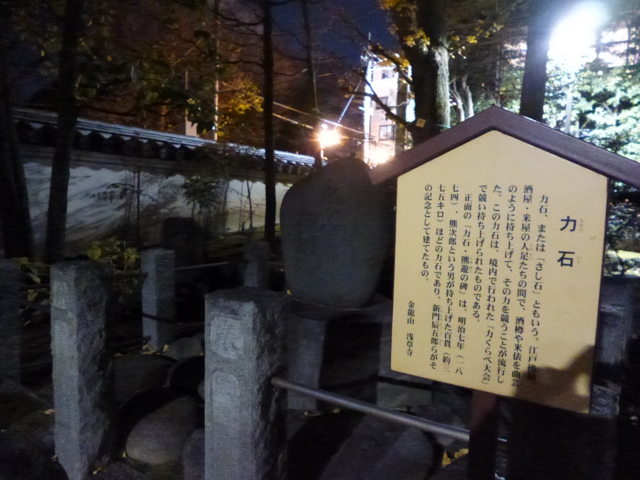 全国の寺社仏閣などでしばしば目にする力石ですが、浅草寺の境内にもあります。石碑の周りに力石が転がっていると思いきや、案内書きによると石碑本体も力石のひとつのようです。その重さは何と375キロ。本当に持ち上げた人物がいるのか逸話なのか、その点が興味深く感じました。