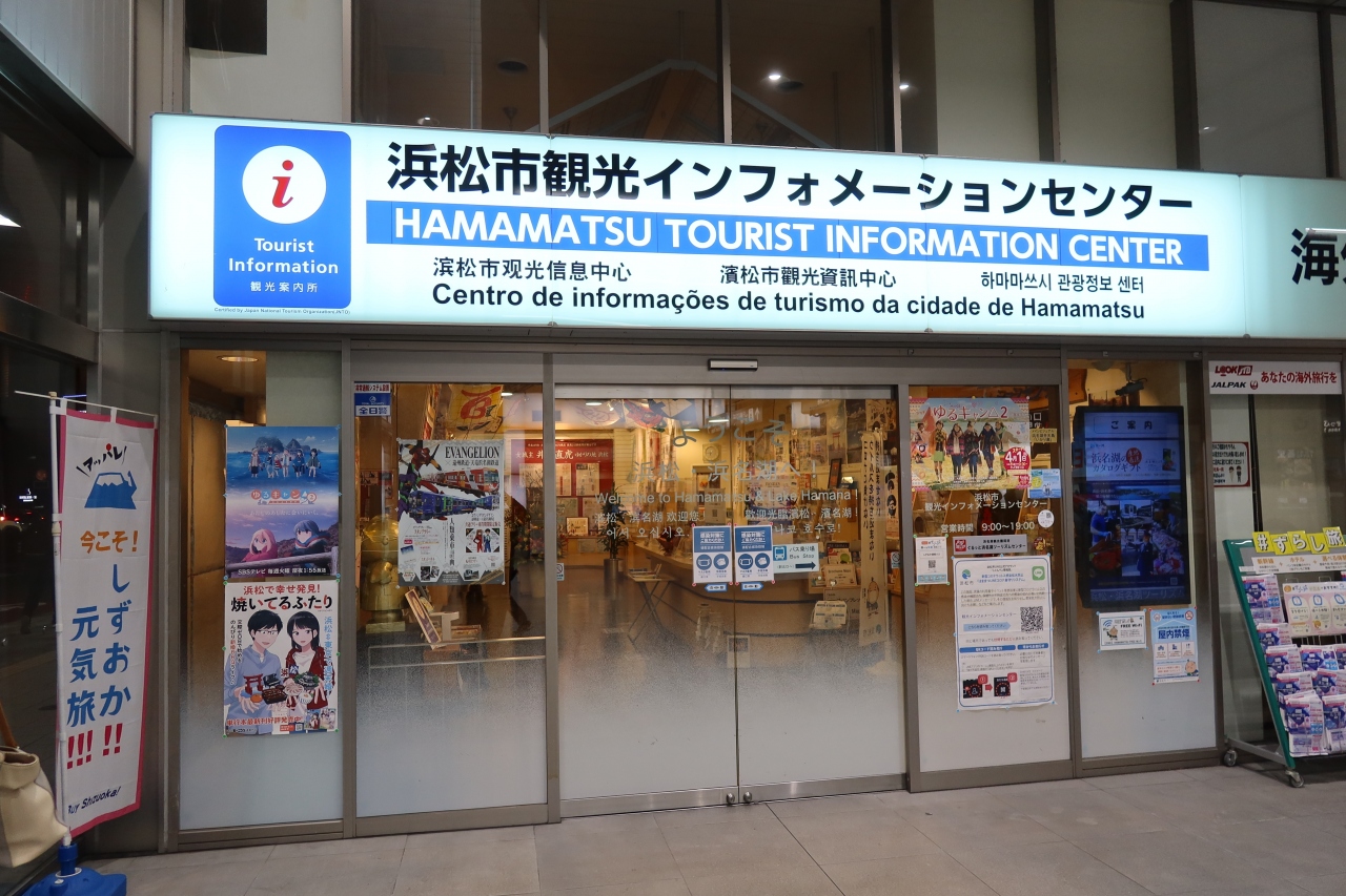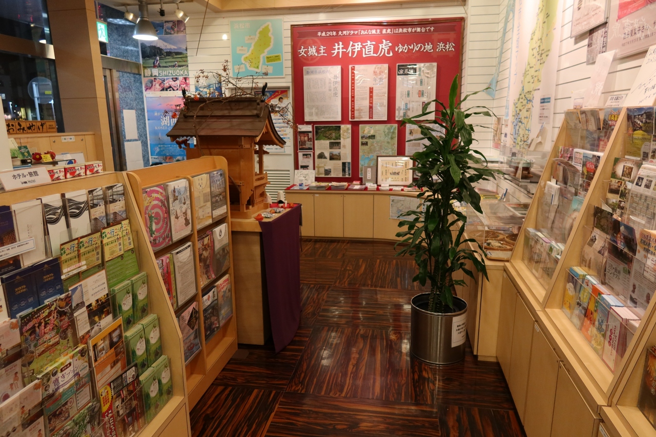 JR浜松駅のコンコース内、南側に浜松市観光インフォメーションセンターがあります。館内には最奥に井伊直虎の縁の地紹介、その手前に観光パンフレット、浜松の名産品紹介、そして、コンシュルジュデスクがあり、デスクでは気軽に旅行の相談や、宿泊の相談に乗ってもらえます。駅中にあるためとても便利で、頼りになります。
