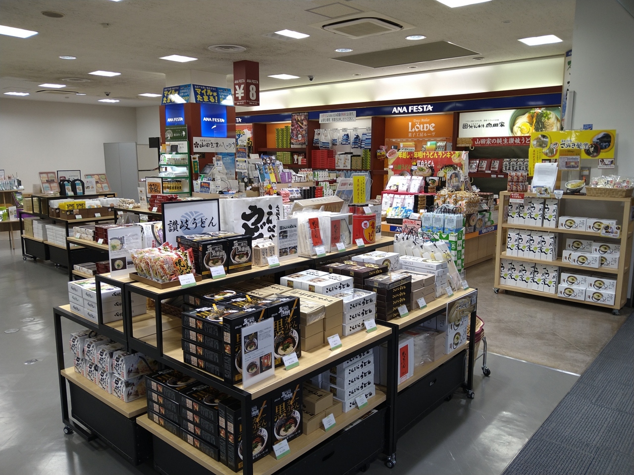 幽玄プレミアムうどんというのを自宅のお土産に買おうと思っていたのですが、こちらの店舗では贈答用パッケージ(3人前)に入っていないものが1人前ずつバラで買えました。期待していたよりうどんやお菓子類の商品数が少ないのが残念でした。ANA FESTAは、保安検査場を抜けた先の搭乗ゲート前にももう1店あります。