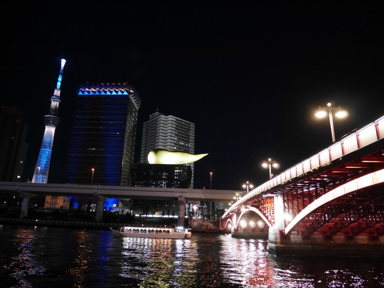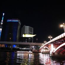 浅草で夕食をとったあと、隅田川テラスを南に進みながら夜景を鑑賞しました。吾妻橋は交通の要所としての役割の大きな橋ですが、夜間のライトアップはとても美しく感じました。橋の北東詰には「アサヒビール吾妻橋ビル」が建ち、橋とコラボした光景が楽しめます。