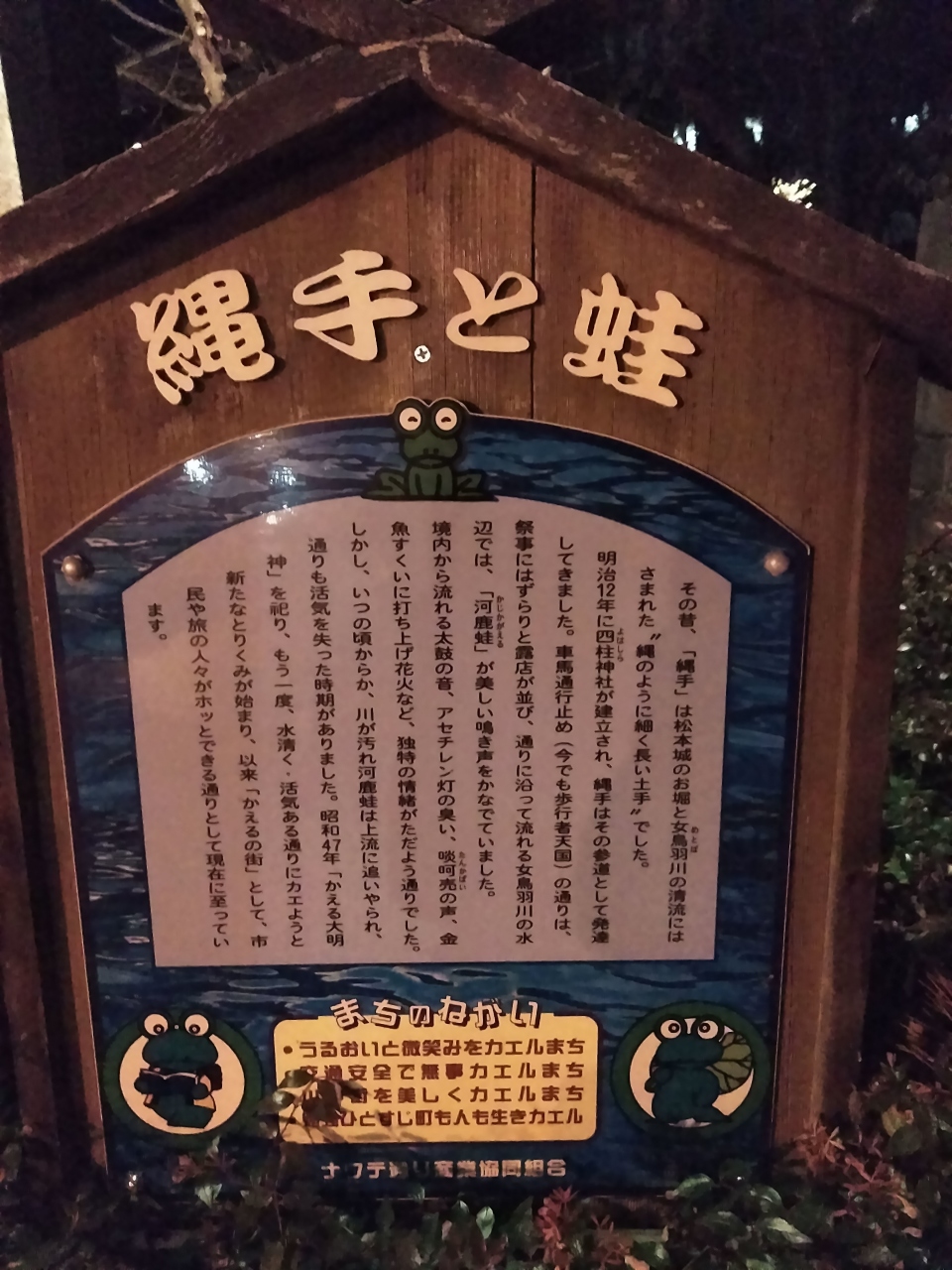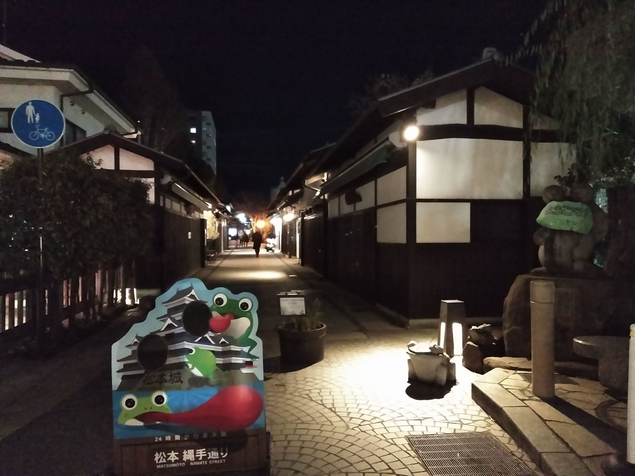 車は有料の市営大手町駐車場へ停めて、「松本ウィンターフェスティバル」のイルミネーションを見に、松本城・大名町通り・千歳橋へ行ったので、そのついでに寄ってみました。お店は閉まっていましたが、灯りが点いていたので「四柱神社」「なわて若返りの水」も見れました。