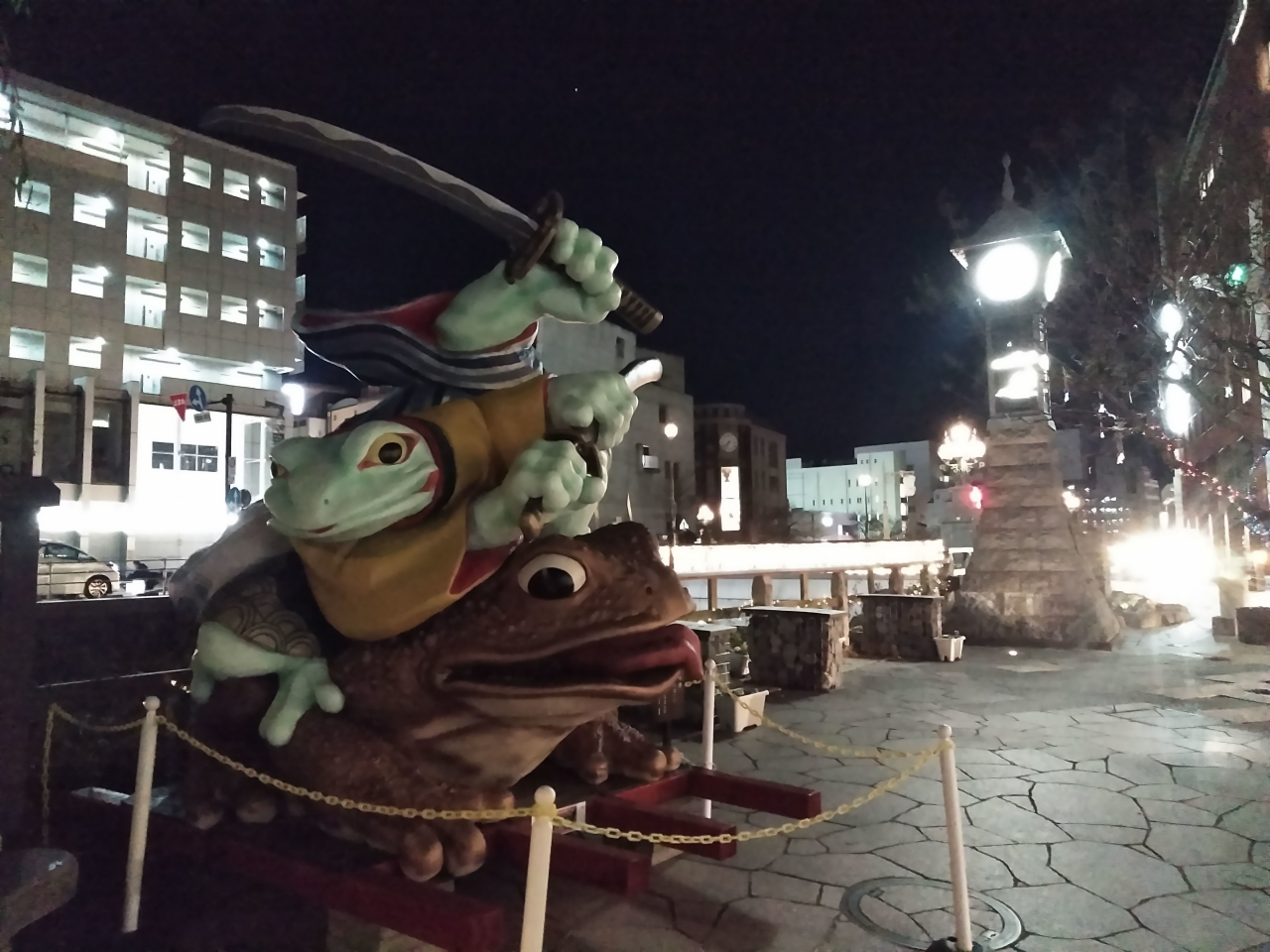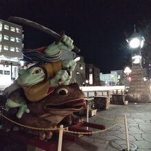 車を有料の市営大手町駐車場へ停めて、松本城・大名町通り・千歳橋のイルミネーションを見に行った帰りに寄りました。大名通りからなわて通りへ入る所にあります。夜でしたが、灯りが点いていたので良く見えました。大きなガマの上に、刀を持ったガマがいます。