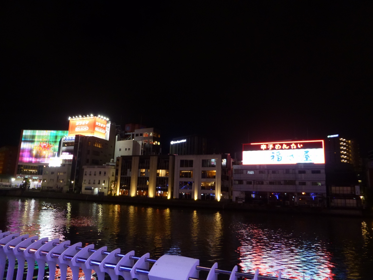 博多の街の中心部を流れる那珂川。博多と言えば川沿いにずらっと立ち並ぶ屋台をイメージしていました。が、思っていたほど屋台が少ない。大阪の道頓堀川のようにネオンがギラギラ川面に映る感じでもない。博多独特の雰囲気のある川でした。