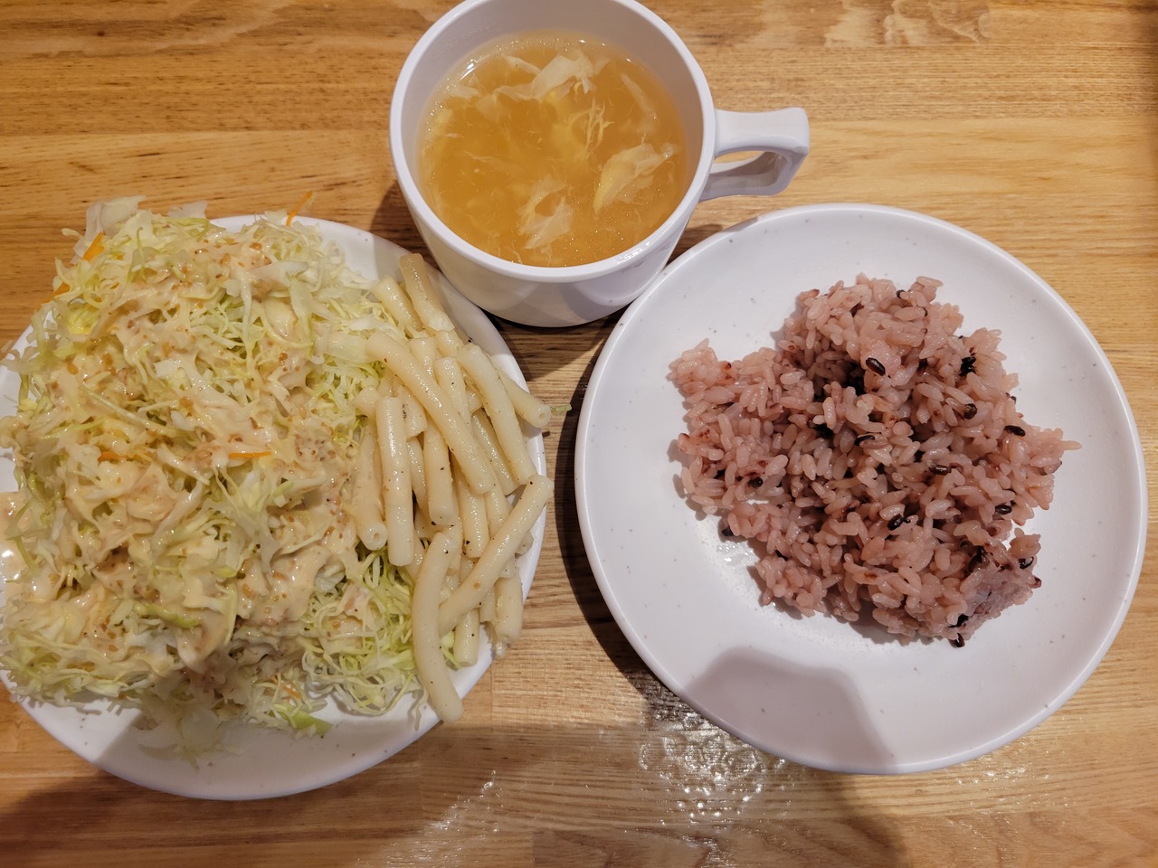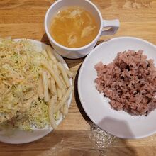 マカロニ)と、卵スープ、白米、黒米は