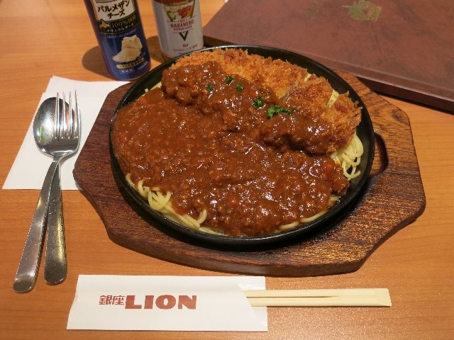 とんかつを乗せたスパゲティの上にミートソースを掛けたボリューミーな1品。ごちそうさまでした。