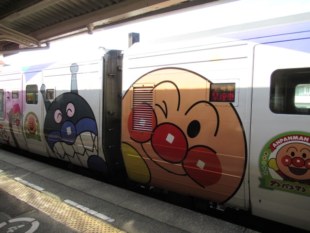 コロナの感染者は減少し緊急事態宣言も解除され、進めていた日本100名城制覇を目指して旅を続けます。今回は四国全9か所を周遊するため松山空港に到着そしてお得なチケットの「setowa四国DC満喫きっぷ」で四国を周遊することにしました。お得な切符は特急も乗り放題で運よくアンパンマン列車の「特急 宇和海」に乗車です。ラッキーな気分でルンルン旅の始まりです。車両の外装はアンパンマンのキャラ絵柄でバイキンマンもいますよ。車両内にはアンパンマンの絵画が置かれメロンパンナちゃんも楽しそうで思わず笑顔がこぼれますよ。足置きもありゆったり楽しく、まずは伊予大洲駅までの乗車でした。
