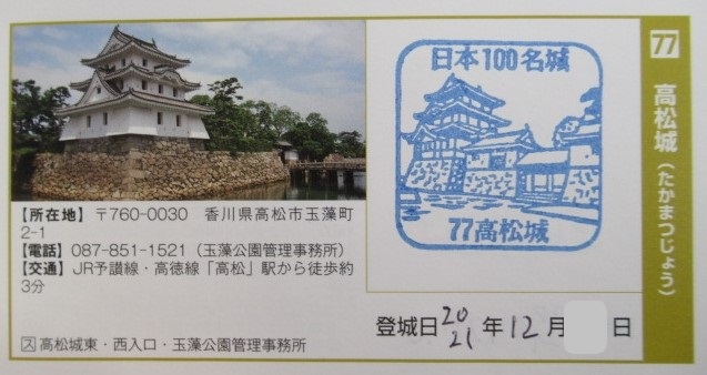 コロナの感染者は減少し緊急事態宣言も解除され、進めていた日本100名城制覇を再開し今回は四国の9ヶ所のひとつである「高松城」の訪問です。いつものように駅前にある観光案内所マップをいただき、徒歩数分で行けるお城は大変便利ですね。1588年の築城でお堀には海水を引き込んだ海城としと有名です。さらに見どころとしては本丸に通ずる唯一の「鞘橋」で趣がありますよ、木造建築で現在の橋は明治17年に建て替えられたものです。ついでに天守台にある展望デッキに登りましょう周辺が一望できますよ。天守はありませんが玉藻公園として整備された公園はアクセスがよく訪問しやすい魅力のある公園と言えるでしょう。