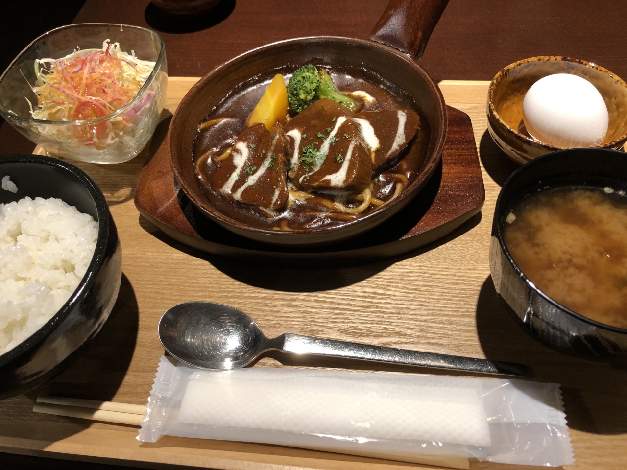 「土鍋煮込み牛タンシチュー」をチョイス、サラダ、味噌汁、おかわり自由のご飯&生卵、テイクアウトコーヒー付き。
