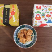 正月に宅配寿司を予約した時、麻布かりんとが付いてきました。金箔麻布かりんと、野菜ミックスかりんと、角ざらめかりんとの三種類のキューブ詰め合わせでした。角ざらめかりんとは小さな四角い形で食べやすかったです。金箔麻布かりんとは黒糖が美味しいです。野菜ミックスかりんとは淡い色と異なる味を楽しめました。美味しかったのでお茶うけに買おうと思います。