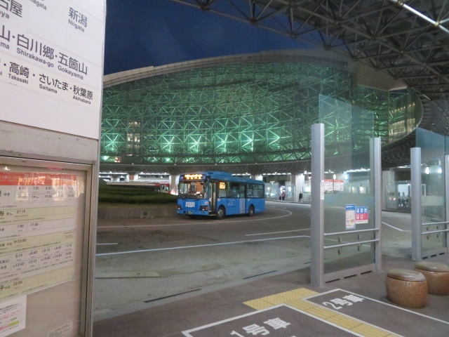 金沢駅のバスターミナルは、大阪に行く長距離バスも、金沢周遊バスもまちバスも全てここから出発するので便利です。あと、夜になると、当然金沢駅の構内にあるおもてなしドームにも灯りがともるのですが、このキラキラのドームを背に、バスが走る姿はなかなか絵になりますね。