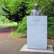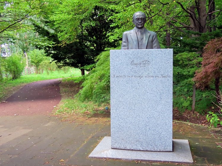 札幌農学校の卒業生で、のちに母校に戻り、教鞭をとった新渡戸稲造。その胸像が花木園の入り口、有名なポプラ並木の近くに置かれています。台座には「I wish to be a bridge across the Pacific」(われ太平洋の橋とならん)と刻まれていました。それにしても正門からけっこう離れていますね。北大キャンパスは広大なので徒歩散策は覚悟したほうがいいと思います。