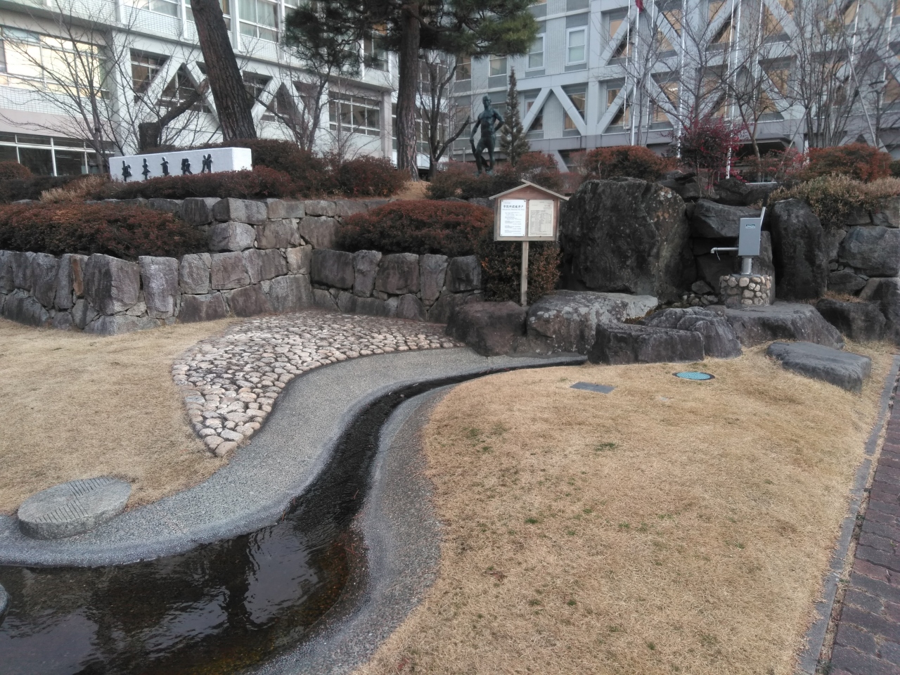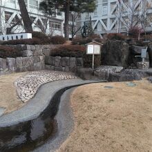 市役所前の道路脇に、石で囲まれた小さな庭があって、その一角に、注ぎ口のある鉄製の四角い箱が立っていました。その下から庭の中を通る、浅いせせらぎが作られていますが、水は出ていませんでした。その横には案内板が立っていたので、それが「井戸」のようでした。