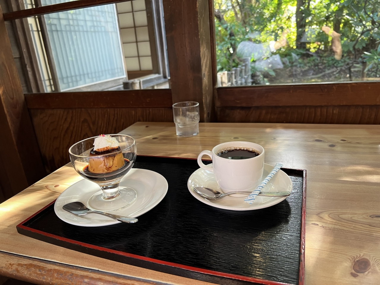 JR北鎌倉駅から線路沿いを鎌倉方面へ徒歩8分、ビーフシチューの名店として知られており、入口の石の階段に行列が絶えません。昼食時間前のカフェ営業で利用しましたが、昔ながらのしっかりとした味わいのプリンとコーヒーのセットは、とても美味。落ち着いた雰囲気の店内でいただきました。