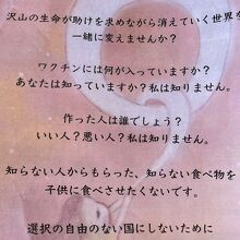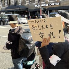 何のデモかと思って見ていたら、「ワクチンから子供たちを守れ!」と書かれたプラカード。