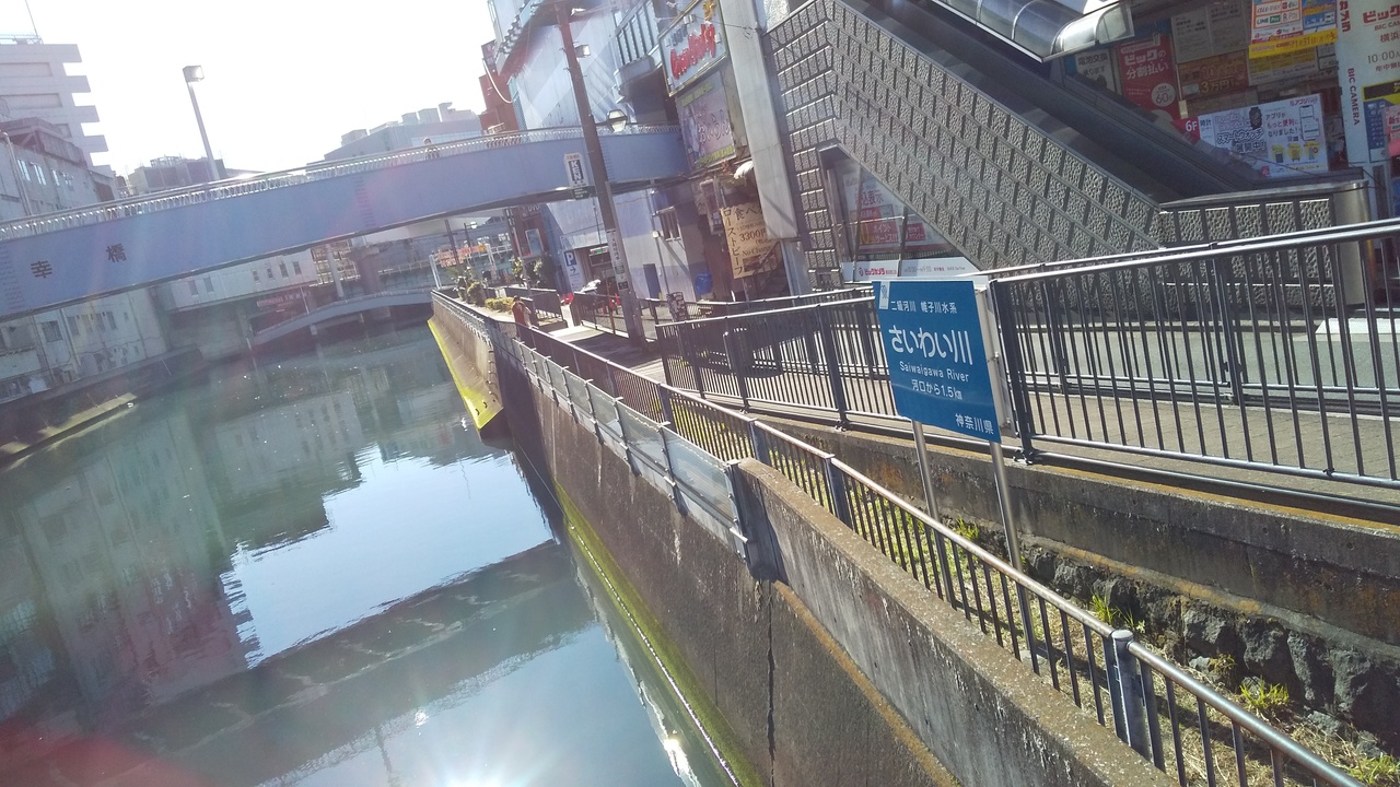 横浜駅の西口を出て、横浜5番街を抜けて、ビブレやビックカメラに向かう途中の橋です。さいわい川にかかる橋です。夜は人の往来のとてもある通りで、端があることに気がつかないかも知れないくらい普通の通りになっています。駅のすぐそばで、護岸の整備された川を見ることが出来ます。