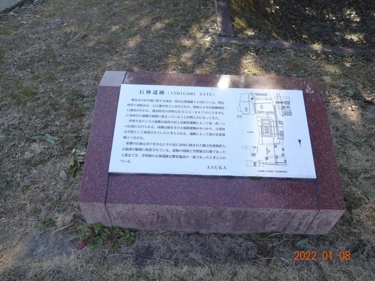 発掘調査の結果では、石神遺跡は斉明朝、天武朝、藤原宮期の遺構だといわれています。