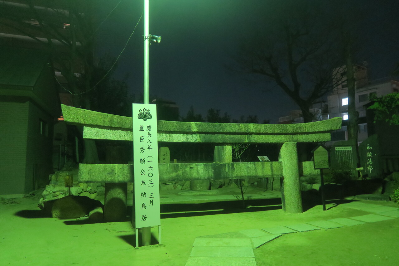 玉造稲荷神社の境内に豊臣秀頼奉献とされる石造りの鳥居が残されています。太平洋戦争をくぐり抜けたそうですが、阪神大震災の際に半壊してしまったそうで、今は上半分だけが残されています。大阪の歴史を見守ってきたと思うと感慨深い遺構です。