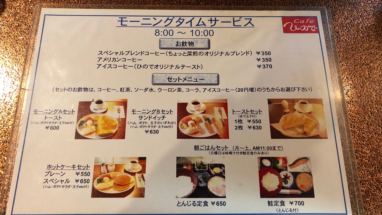 大通駅近くの「日之出ビル」のB1Fにあります。個人経営の昔ながらの喫茶店です。8~10時のモーニングメニューをいただきました。パンケーキ・ポテトサラダ・ゆで卵・コーヒーがついて650円でした。とん汁朝食、焼き鮭・とん汁朝食といった、和朝食もあるようでした。