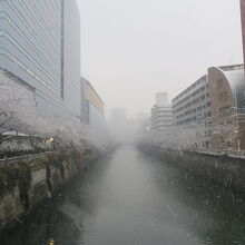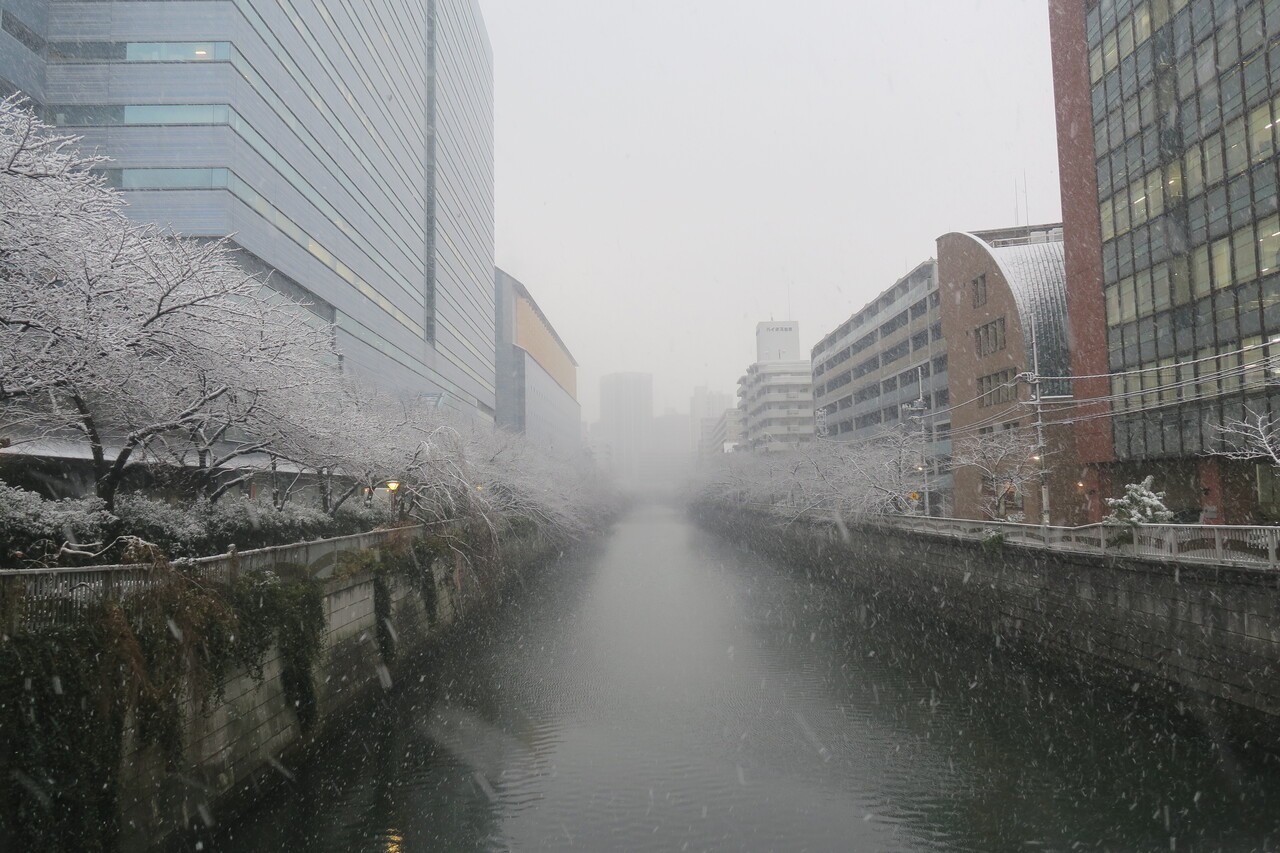 東京に大雪が降った一月のある日、雪景色の目黒川は桜並木に雪が降り積もって、一面の銀世界になっていました。桜が咲いているようにも見えました。桜並木沿いは車両通行不可の場所も多いので、しばらく雪が残っていました。