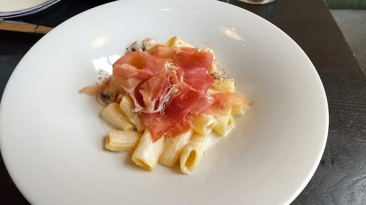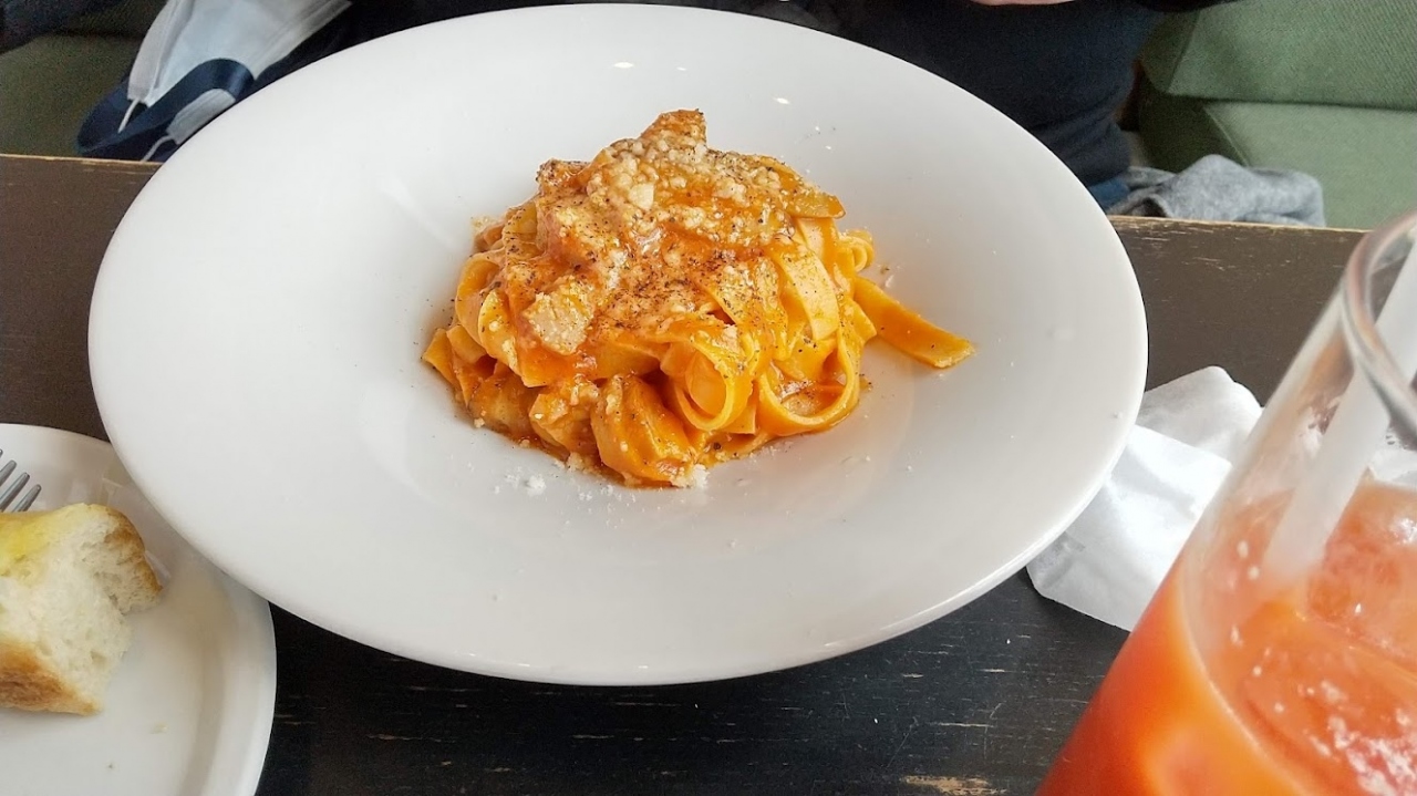 大阪市立美術館の帰りに食事しようと食べログから金曜日の13時15分に席だけの予約を入れておいた。15分刻みでのネット予約ができる。平日食べログから予約するとランチドリンクのサービスがあるという。美術館の観覧に少し手間どって、急いで移動したら13時20分頃に到着した。予約の名を告げると一番奥まった席に案内してくれた。食べログのクーポンについて質問すると一人一杯のドリンクが無料になるという。お一人だけというクーポンも多いが大盤振る舞いだ。とはいえ、ランチドリンクは元々250円だという。コーヒーならその程度でも納得だが、私たちはブラッディオレンジジュースを注文した。単体で注文すれば、800円と言われても不思議ではない。それが通常でも250円、食べログクーポンで無料サービスとなる。しかも、大阪市立美術館の中で見つけた「てんしば&i:na Special Coupom」を二枚持参したところ、角にある500円のクーポンが一人一枚利用できるという。食べログのクーポンと併用できるというので驚きだ。今日のランチから、生パスタセット1250円「鶏モモ肉と国産ゴボウのトマトソース」と、週替わりショート生パスタセット1300円「パルマ産生ハムとマッシュルームのクリームソース」を注文した。サラダも欲しかったので、「厳選トマトのブルスケッタ」680円をシェアすることにした。すぐにセットメニューの「愛知県産玉葱と人参のスープ」がカップで来た。飲みやすくて美味しかった。続いて飲み物が来て、大きなオリーブフォカッチャが二つ籠に入ってやってきた。ブルスケッタは想像よりかなり小さかった。そして注文後10分ほどで、パスタが来た。生パスタはトマトソースのフェットチーネ、ショートパスタは胡椒とパルミジャーノレッジャーノチーズが効いたクリームソースのリガトーニだった。どちらも熱々でアルデンテの茹で方もよかった。妻はどちらも同じくらい好きと言っていたが、私はクリームソースが気に入った。生ハムも美味しかった。これでスープとフォカッチャがついて1300円とはコスパ抜群というべきだろう。そのうえ、会計ではイーナのクーポン500円が一人一枚使えて千円引き、食べログクーポンでドリンク無料で、本来3730円のはずが、なんと全部で2230円だった。駐車場は天王寺地下駐車場を利用したが、このレストランとは提携していないとのことで割引の適用はなかった。
