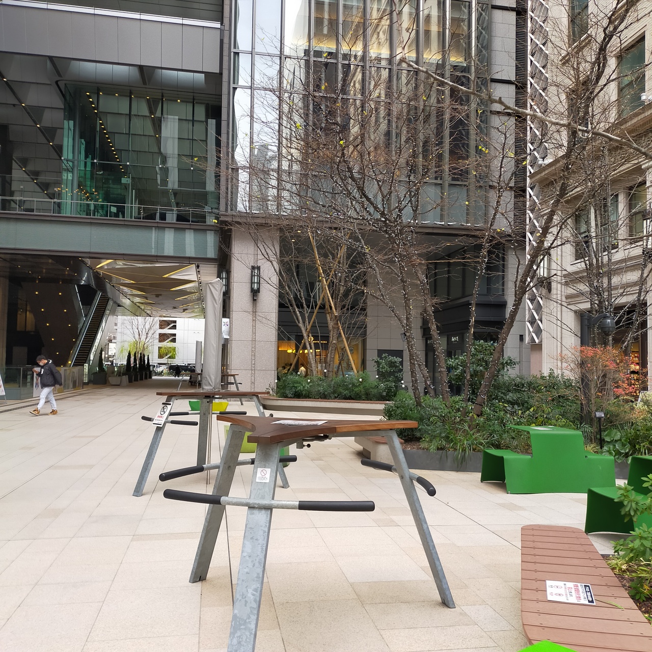 休日のお昼ごろに行ってきました。京橋の明治屋とつながる商業ビルエリアです。ブリジストンなどが入っています。真ん中は広場になっていて、休憩できます。周りには飲食店などがあります。鎧塚さんのお店もあります。