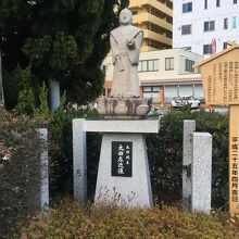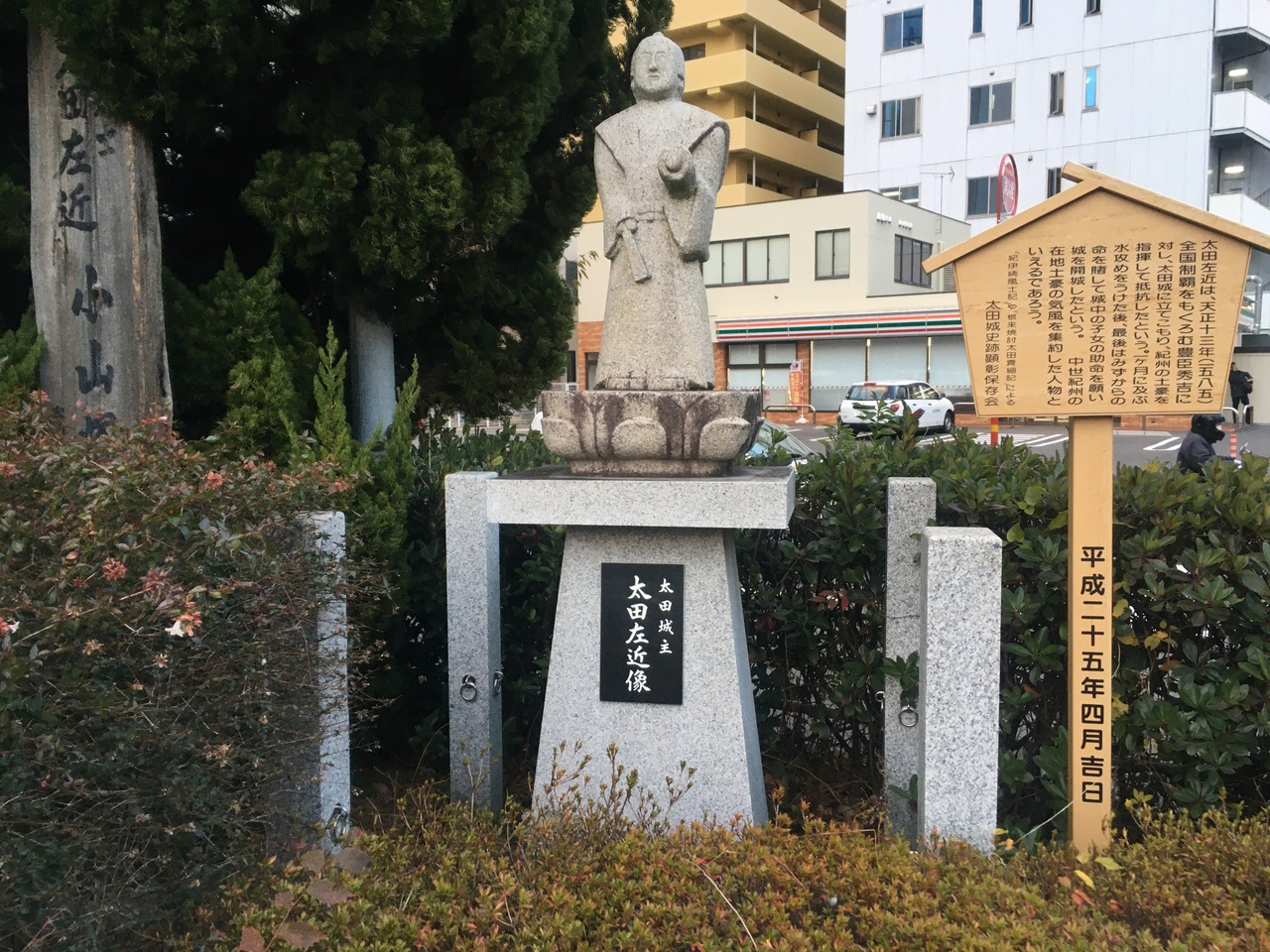 和歌山駅東口ロータリーに石像と案内板が建っています。天正13年羽柴秀吉の紀州攻めで太田城が落城しました。太田左近を大将とする雑賀衆太田党は一か月にわたり篭城し抵抗しましたが最後は秀吉の水攻めされ、ついに一族は自刃し開城したのです。「中世紀州の在地土豪の気風を集約した人物といえるだろう」と案内板に書かれていました。思ったより小さな像で、ひっそりと立っていました。