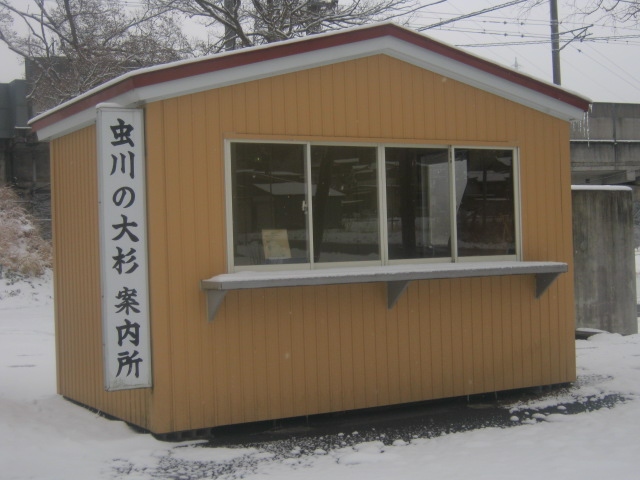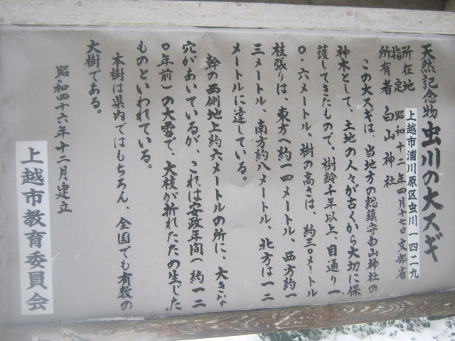 現在は上越市域、旧浦川原村域にある国の天然記念物にも指定されている立派な大杉です。公共交通機関利用の場合は、文字通り、北越急行(ほくほく線)に虫川大杉駅という駅がありますので、判りやすいと思います。