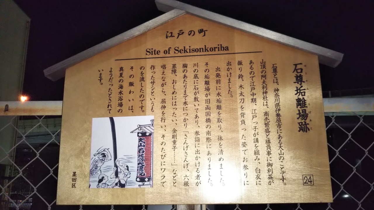江戸時代、阿夫利神社に詣でる前に隅田川のこの場所で身を清める風習があったとのことで、この案内板が残っています。