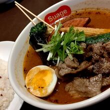 オリジナルブレンドのスパイスやゴロゴロとした大きな具材が使われています。辛さのレベルやトッピングも豊富にあります。