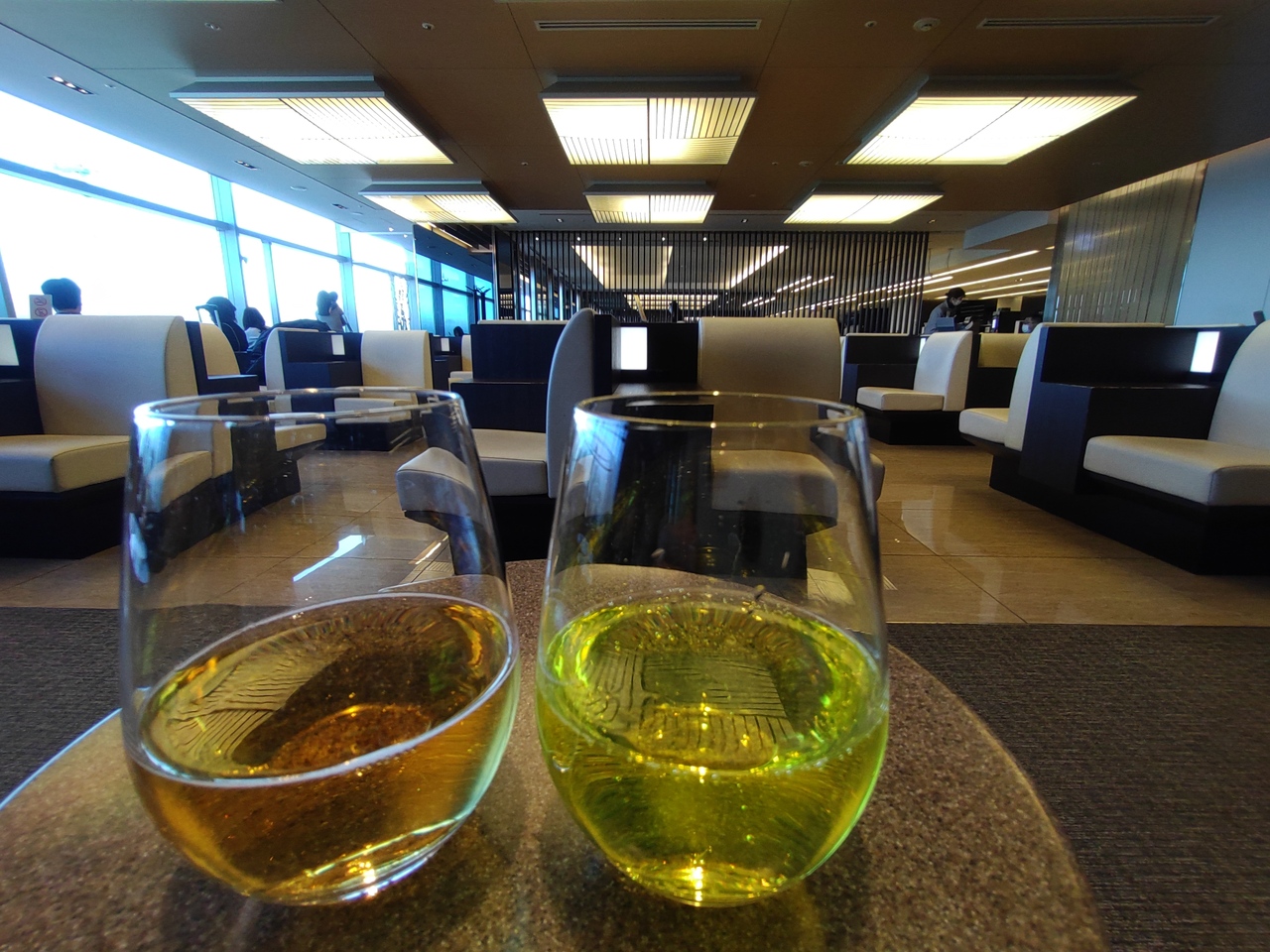 ANAプレミアムチェックインを通過してまっすぐ行くと、エスカレーターでANAラウンジにつながっています。もちろん搭乗口からも行けますが、混雑を避けられる優先ルートになっていました。疲れ気味だったので、ちょっとのビールとちょっとのリアルゴールドでエナジーチャージ。ラウンジの広さはさすが羽田空港です。