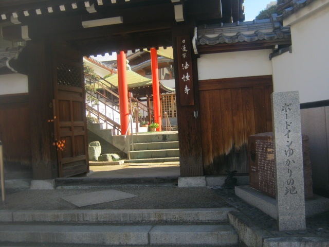 今回は、高津宮を拠点に付近の寺を巡る途中で、法性寺の山門手前で、たまたま見つけたのがこちらでした。氏の逗留の地としての経緯を刻んだ立派な解説付きの碑には、ボードウィンと記され、ゆかりの地としての石碑はボードインと表記されているのも味わい深かったです。これを読みつつ、お寺の境内を散策して、氏が逗留していた当時の風情に浸ると、とても情趣が感じられるかなと思います。