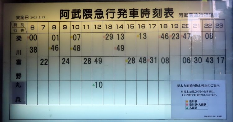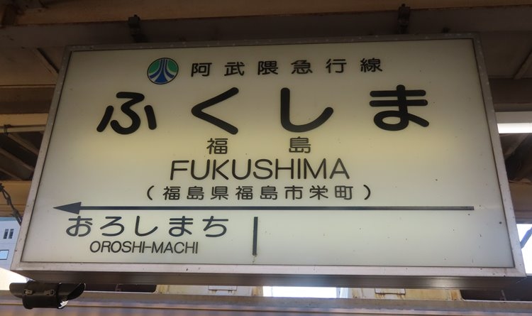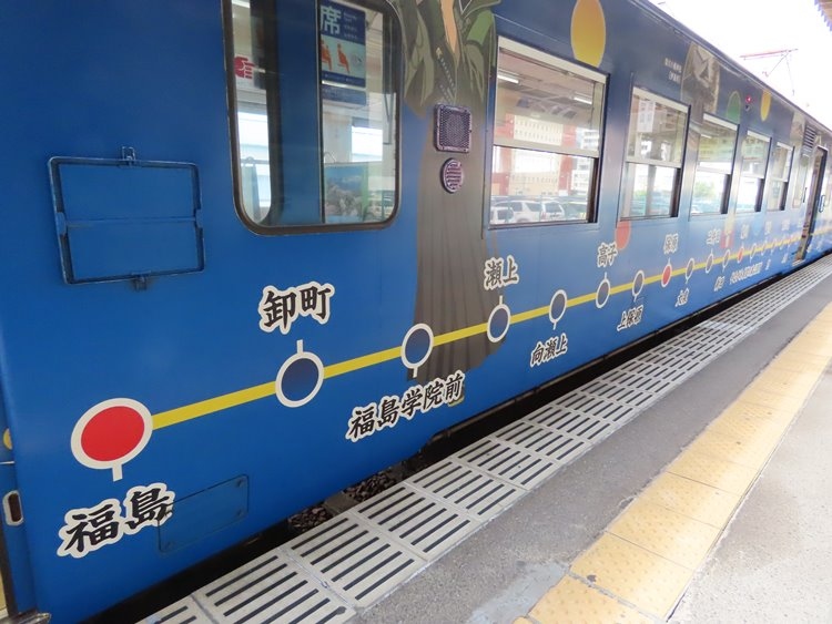 阿武隈急行線は福島駅から宮城県柴田町の槻木駅に至る24駅、営業キロ54.9kmのローカル私鉄です。JR福島の改札をいったん出て乗換えます。ひとつのホームを福島交通飯坂線と仲よく使っています。改札を入って左側が阿武隈急行で、このときは「政宗ダテニクル」のキャラが散りばめられたコラボ・トレイン(8100系)が入線してきました。車体に沿線の駅名が書きこまれていてほほえましかったです。