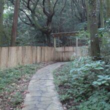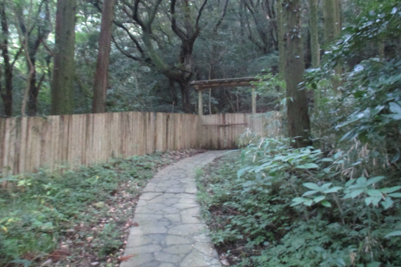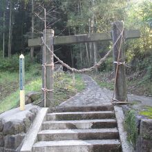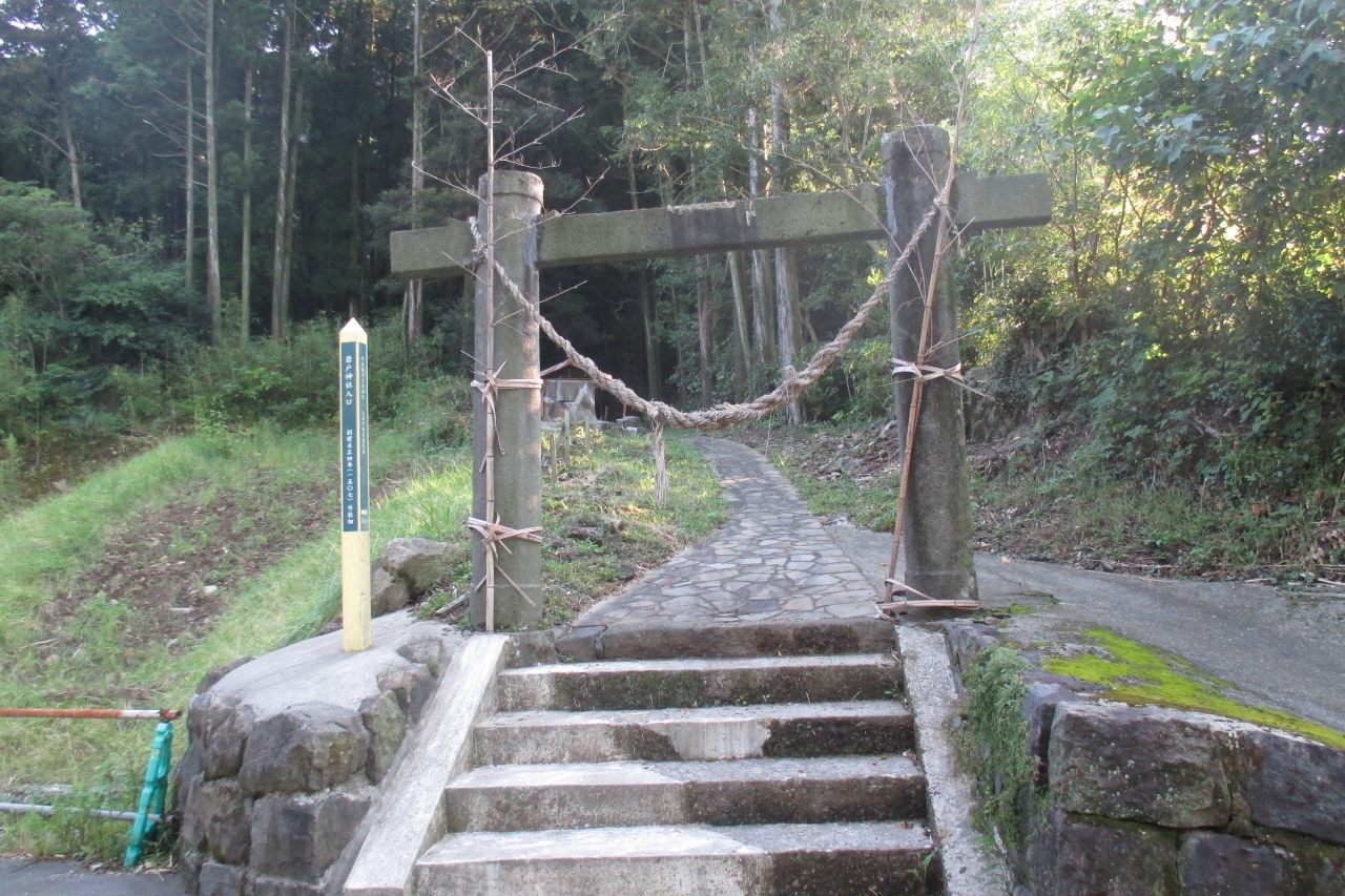 まず鳥居の形が変わっていました。柱に竹が縛り付けてあります。また、注連縄?が妙に垂れ下がって渡されていました。これは普通の神社とはずいぶんと違うぞと思わせられます。鳥居をくぐって進むと、板塀に囲まれてしまいました。そして、扉があって閉められています。動物除けかと思いましたが、少し横は何もありませんから、そうではなさそうです。そこから中を覗くと、最近、人の歩いた様子がありません。渓谷沿いを歩くこと1kmと書かれていますから、これは素人のおとずれるところではなさそうです。事故を起こす前に諦めました。